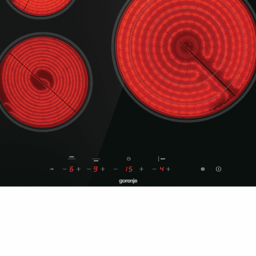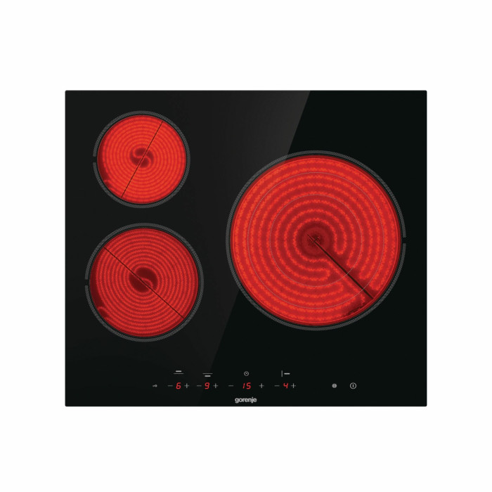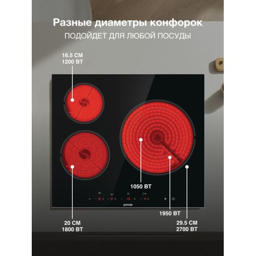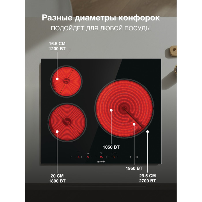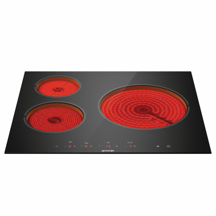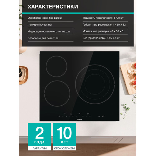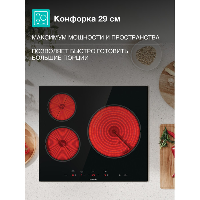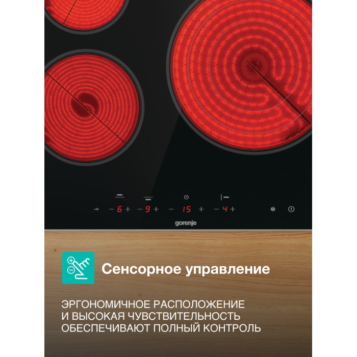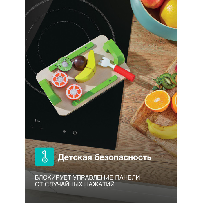 защитное отключение конфорок, индикатор остаточного тепла, кнопка блокировки панели