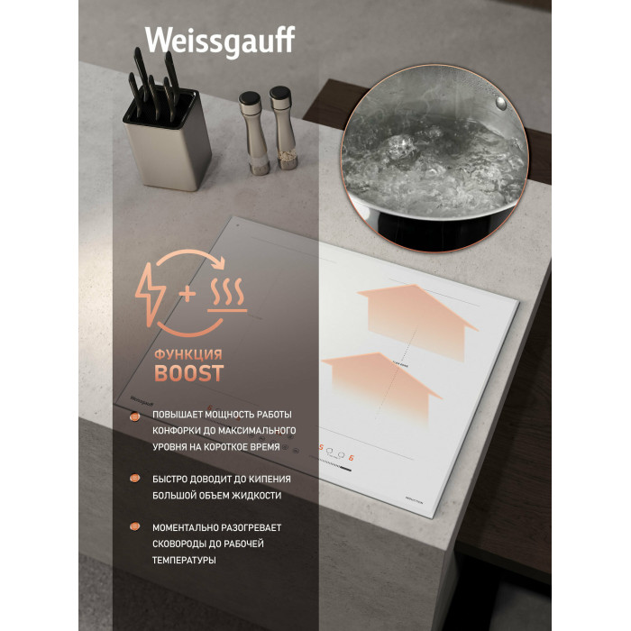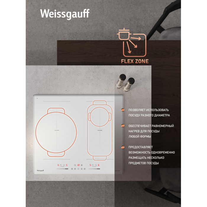 кратковременная пауза, поддержание тепла, распознавание наличия посуды, таймер, функция Booster, функция Flex Zone