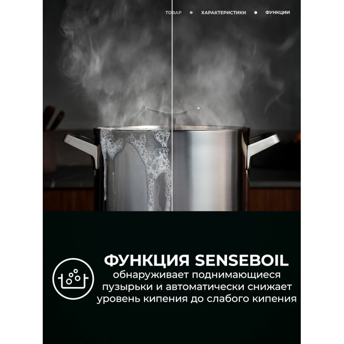 автоматика закипания, кратковременная пауза, распознавание наличия посуды, Быстрый нагрев, Индукционный мост