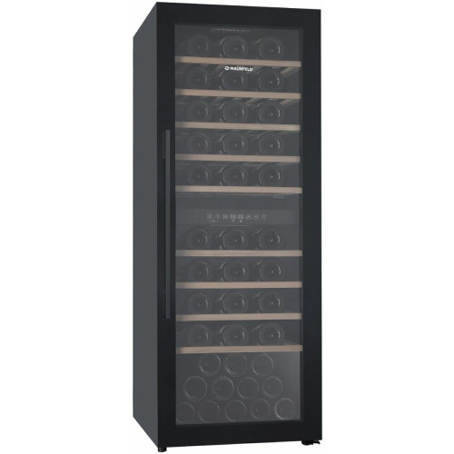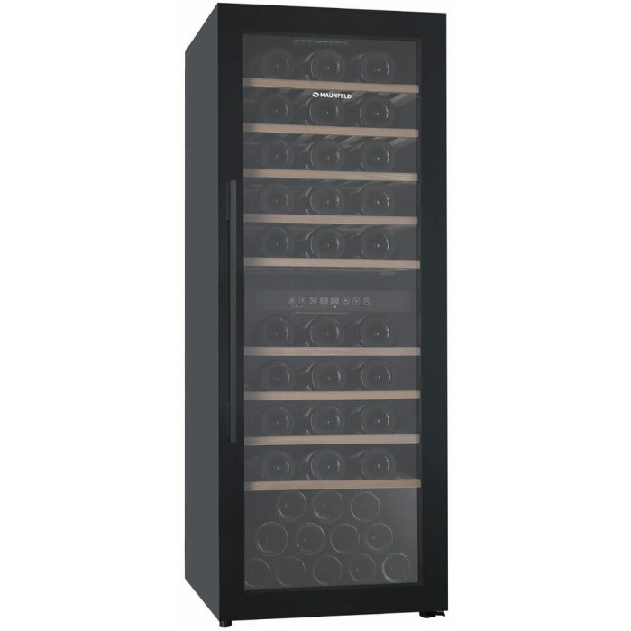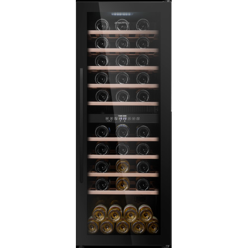 тип винного шкафа: двухтемпературный, высота: 128.50 см, ширина: 48 см, глубина: 61.80 см, емкость винного шкафа, бут.: 77, количество камер: 2, класс энергопотребления: G, тип компрессора: стандартный, цвет корпуса: чёрный