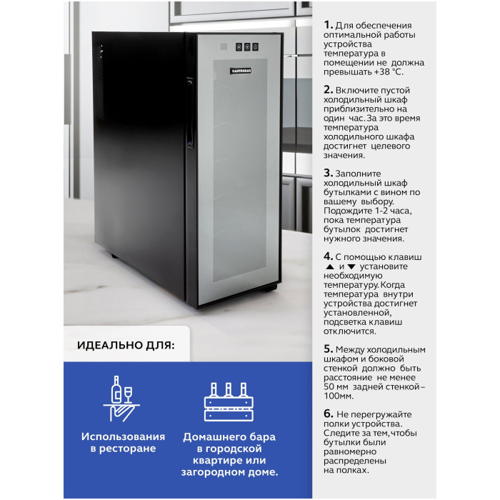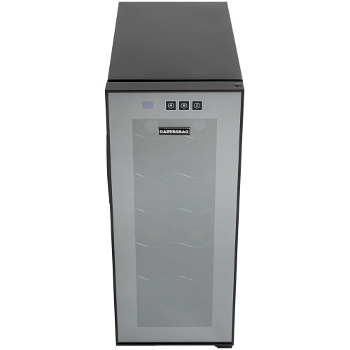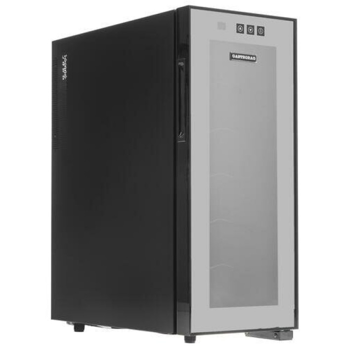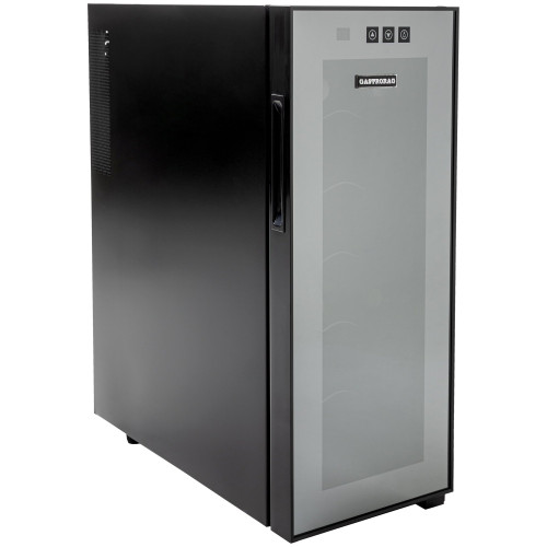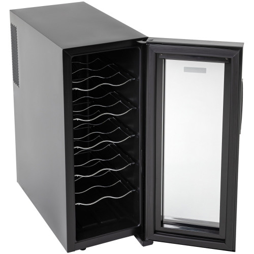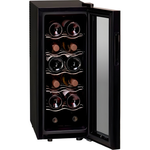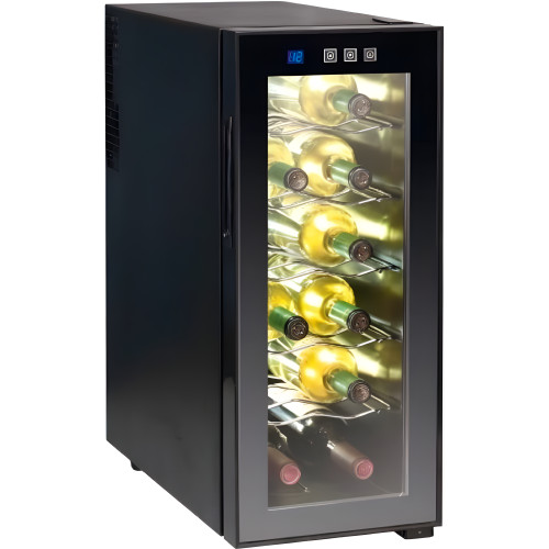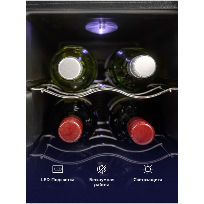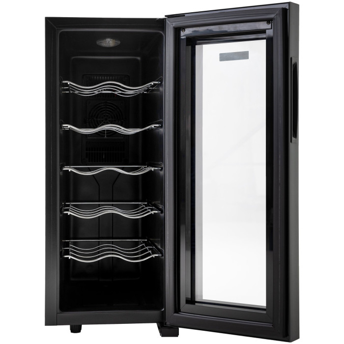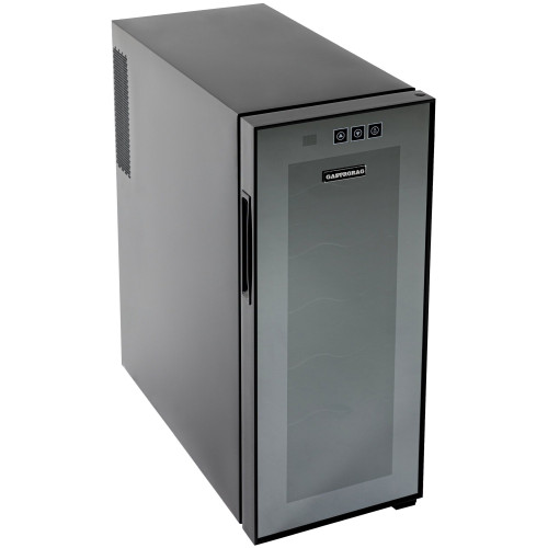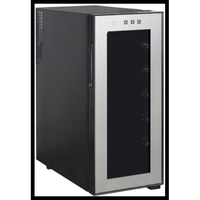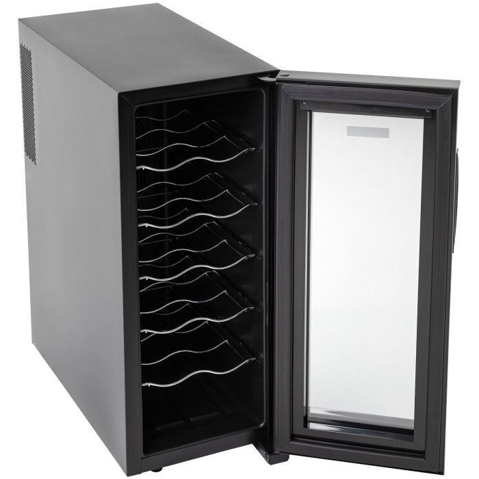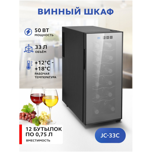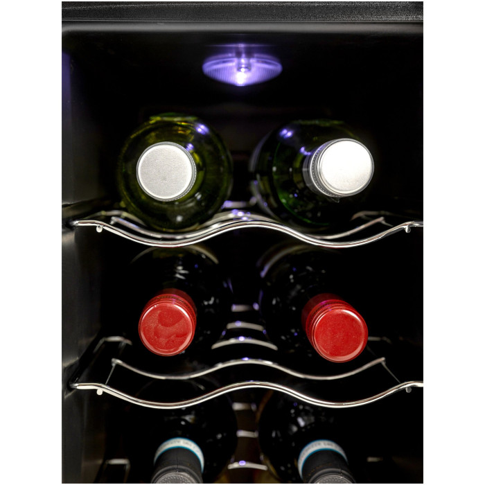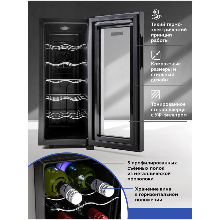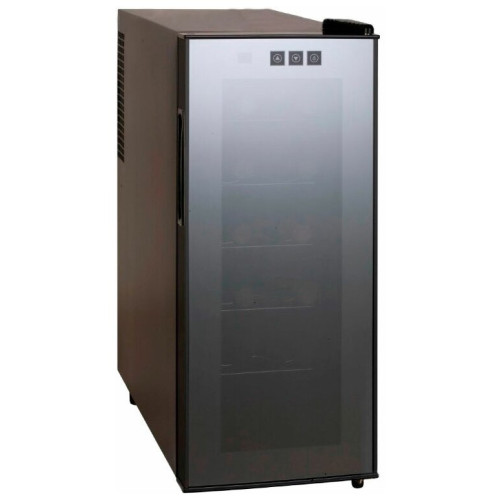 термоэлектрический (без компрессора), +12.+18оС, 33 л, 1 стеклянная дверца, подсветка, сенсорное управление, вместимость 12 бутылок 0,75 л, цвет черный