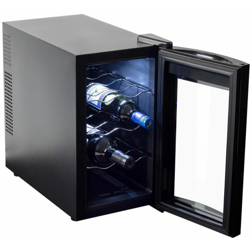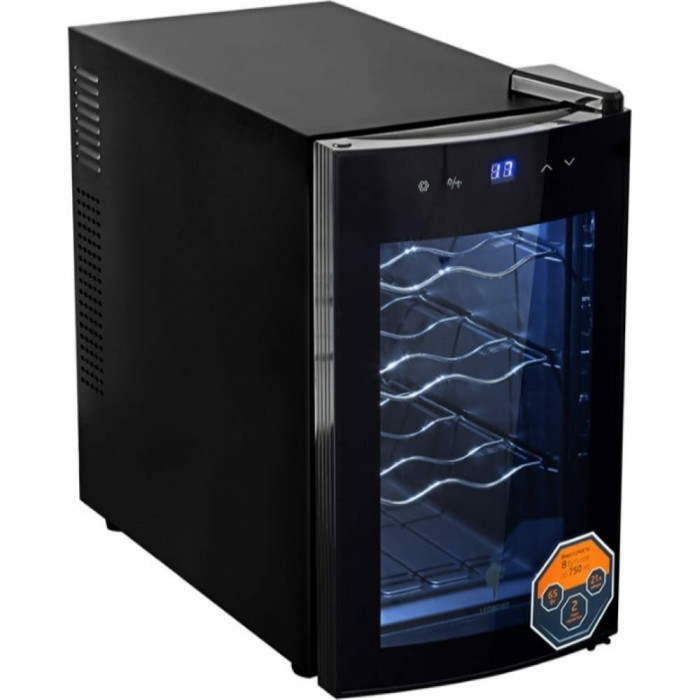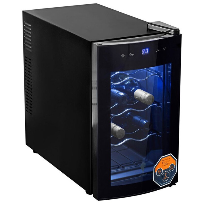 Винный шкаф Leonord LE-1704 имеет три полки и вмещает одновременно до восьми бутылок. Для оптимальной видимости содержимого предусмотрены яркая внутренняя подсветка и прозрачное стекло в дверце. Общий объем камеры составляет 21 л. Комфортные условия эксплуатации обусловлены незначительным уровнем шума в процессе работы устройства, который не превышает 32 дБ. На символьном LED-дисплее отображается текущая температура воздуха внутри модели.