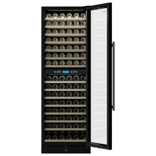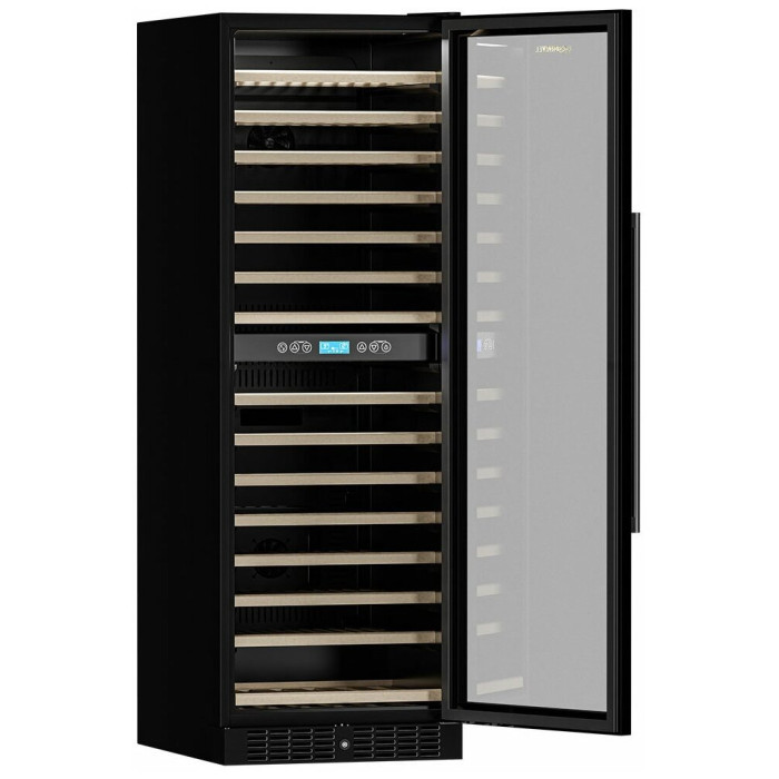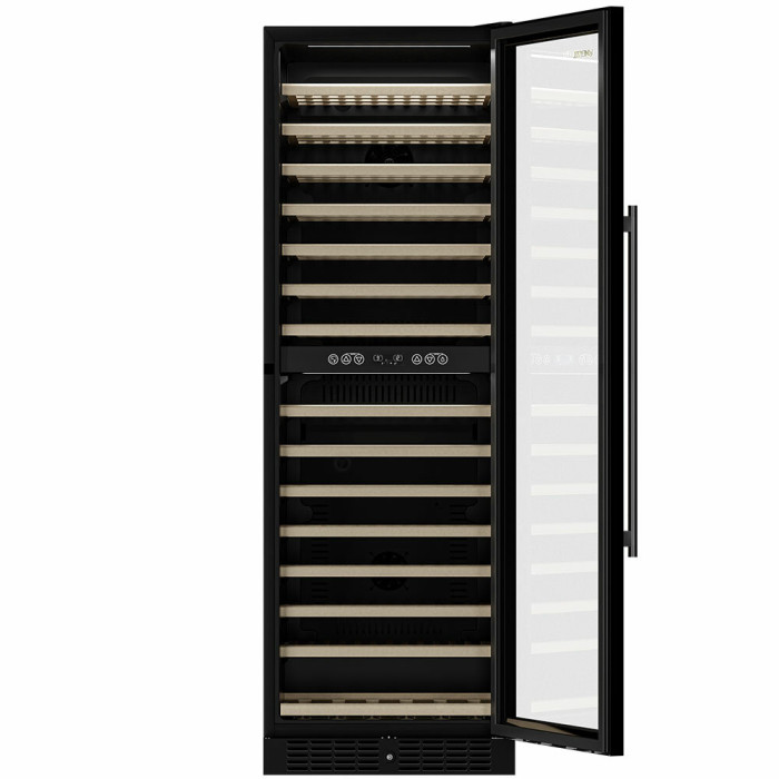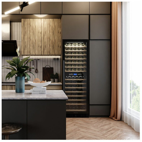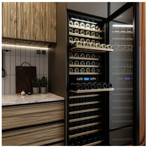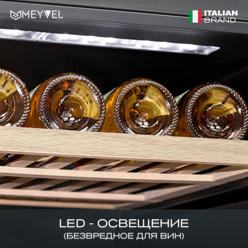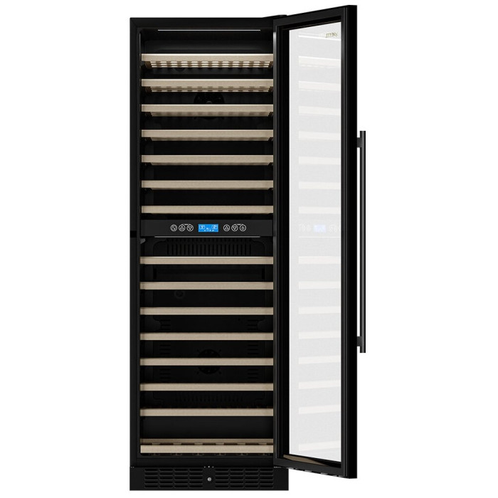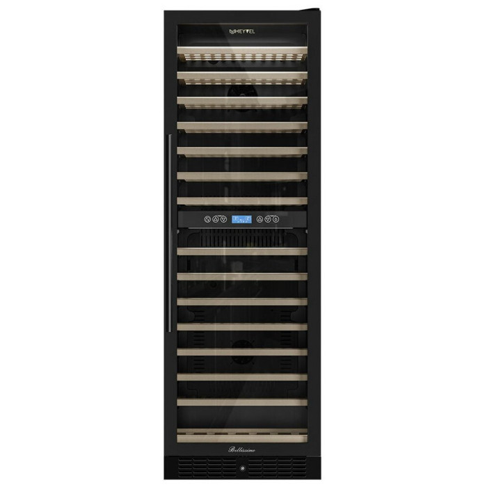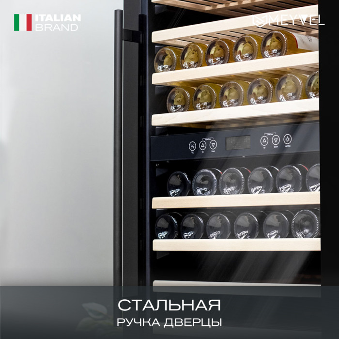 Винный шкаф Meyvel MV160-KBT2 имеет привлекательный внешний вид, сочетающий в себе неподвластное времени очарование натуральных материалов с высокотехнологичными системами сохранения продуктов. Винный холодильник Meyvel MV160-KBT2 оснащен дверью с защитой от ультрафиолетовых лучей и отлично подойдет для хранения и созревания различных сортов вин. Динамическая система охлаждения обеспечивает оптимальную температуру для вина и сохраняет необходимую влажность внутри камеры. Компрессорный винный шкаф Meyvel MV160-KBT2 обладает большой вместимостью и способен разместить до 160 бутылок. Располагаются они на полках из массива бука. Внутреннее пространство шкафа разделено на 2 температурные зоны с возможностью настраивать каждую из них: диапазон нижней зоны от +5°C до +10°C, а верхней - от + 10°C до +18 °C. Холодильник поддерживает влажность в диапазоне 60-80%, как в настоящем винном погребе. Быстро задавайте необходимую температуру для содержимого и управляйте всеми функциями холодильника с помощью интуитивно-понятного расположения кнопок на сенсорном дисплее. Так же, эта модель имеет возможность регулировать ножки по высоте, что позволяет установить шкаф в любое удобное место на Вашей кухне. Преимущества винного шкафа Meyvel MV160-KBT2 Вместимость 160 бутылок 0,75 л; Две температурные зоны; Общий температурный диапазон от +5°C до +18°C; Память настроек; Удобное сенсорное управление; Автоматическая разморозка; Тройное стекло с УФ-фильтром; Наличие двух полок с увеличенным пространством, для размещения нестандартных бутылок; Стальной чёрный корпус; Можно установить шкаф отдельно или встроить в колонну; Возможность регулировать ножки; Выдвижные полки из массива бука. Дополнительные параметры Количество зон: две Температурный режим: +5.+18 °C (верх +5.+10/ ниж. +10.+18) Количество бутылок: 160 шт. Условие эксплуатации: +10.+38 °C Возможность встроить: есть Хладагент: R600a Охлаждение: динамическое Вид охлаждения: компрессорное Дверь: стеклянная в черной раме, стекло с защитой от УФ Ручка двери: навесная, черная Полки: 15 шт, деревянные (без телескопов) Подсветка: есть, LED Объем: 425 л. Внутренняя влажность: 30-60 % (ванночка с водой, в комплекте нет) Потребляемая мощность: 140 Вт Энергопотребление в сутки: 0,644 кВт Энергетический класс: G (по таблице классов с 2021г) Номинальное напряжение: 220 В, 50 Гц Корпус: черный, металлический Разморозка: автоматическая Угольный фильтр: есть Зимний режим: есть Перевеска двери: есть Замок: есть Управление: сенсорное Уровень шума: 45 дБ Размеры (ШхГхВ): 595х680х1769 мм Масса (без упк./в упк.): 100/113 кг Размеры ниши (ШхГхВ): 600х685х1775 мм Размер в упаковке (ШхГхВ): 663х736х1805 мм Гарантия производителя: 2 года