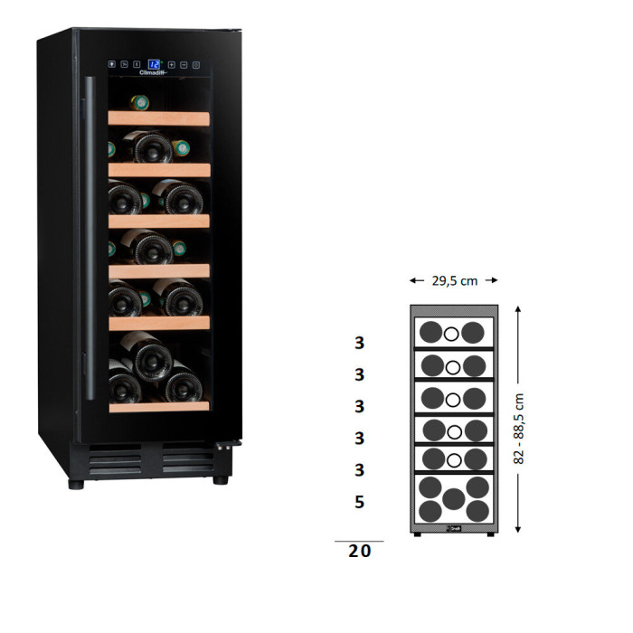Монотемпературный винный шкаф Climadiff CBU18S2B, рассчитанный на 18 бутылок (типа Бордо), является встраиваемым. Скромные размеры и возможность перенавесить дверцу позволяют вписать шкаф в любой интерьер. Наличие удобных полок из массива дерева дает возможность рассортировать коллекцию, а благодаря дверце из стекла с АУФ-тонировокй бутылки будут надежно защищены от света.