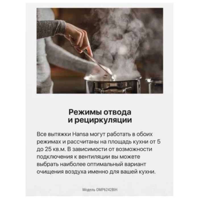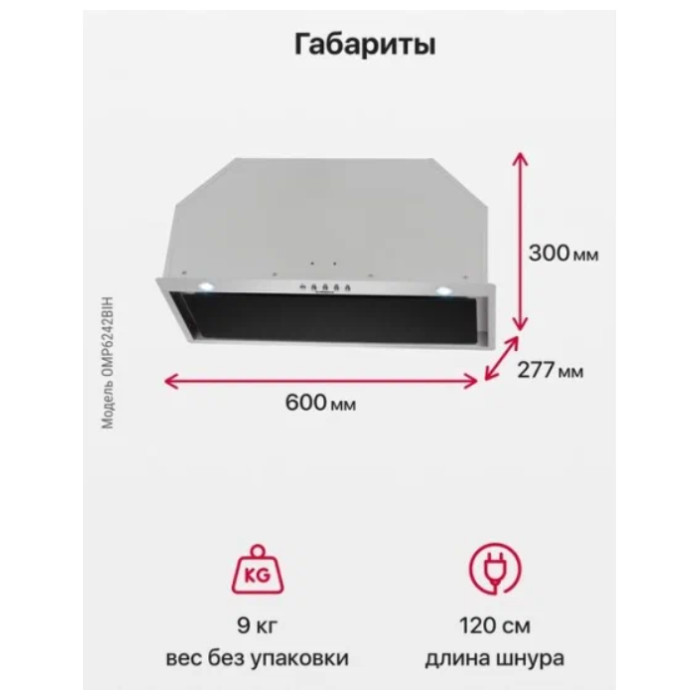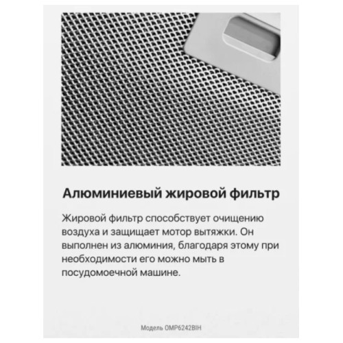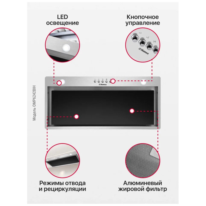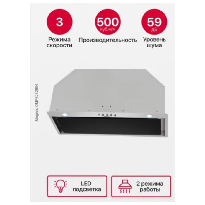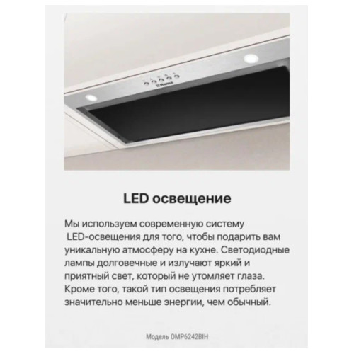Встраиваемая вытяжка Hansa OMP6242BIH без усилий справится с очисткой воздуха в кухне средних и больших размеров благодаря своей производительности 500 кубометров в час. Во время жарки лучше включить 3 скорость, а вот для томления достаточно первой скорости, которая регулируется механическим переключателем, впрочем, как и LED подсветка, которая ярко осветит рабочую зону под вытяжкой.