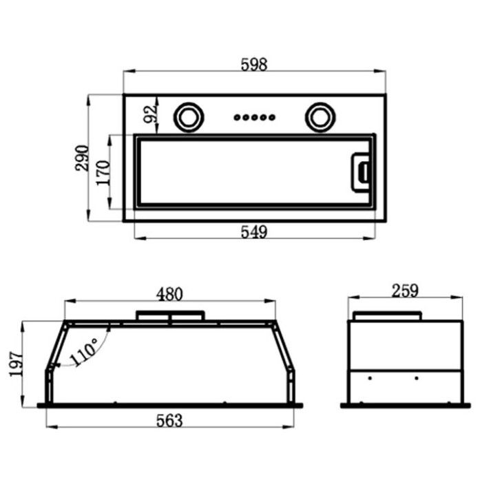площадь кухни до 20 м2; угольный фильтр CF110; сменный фильтр в комплект не входит; количество ламп освещения: 2; мощность каждой лампы: 2 Вт