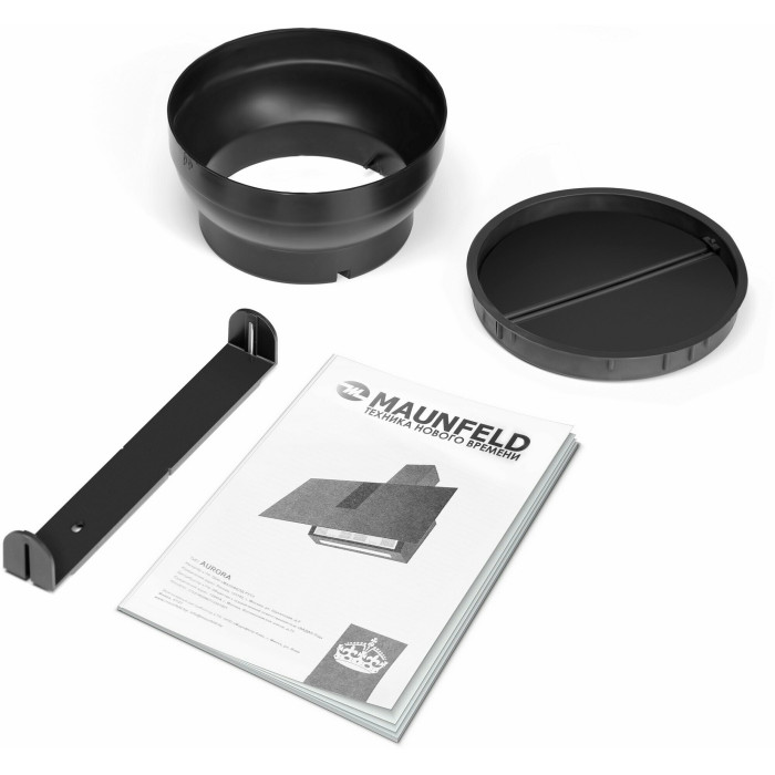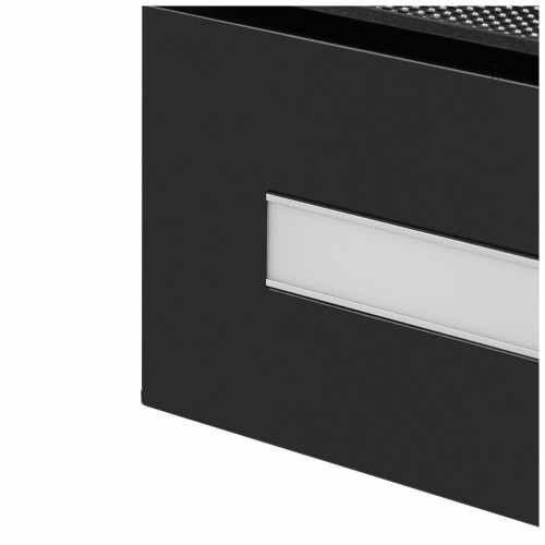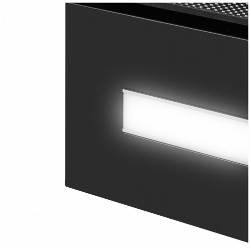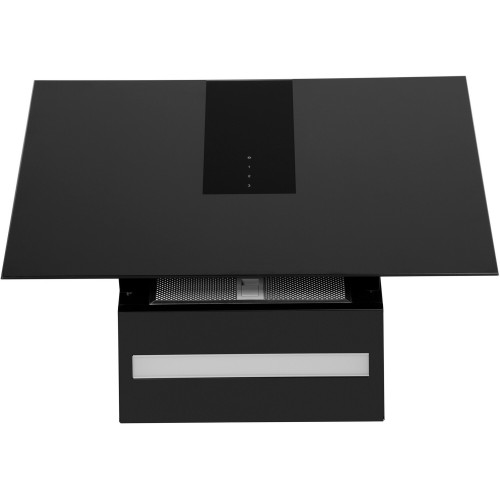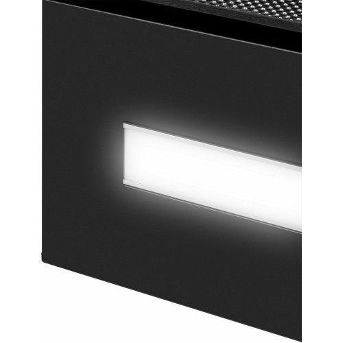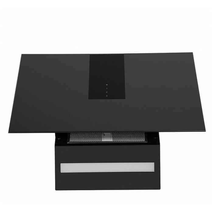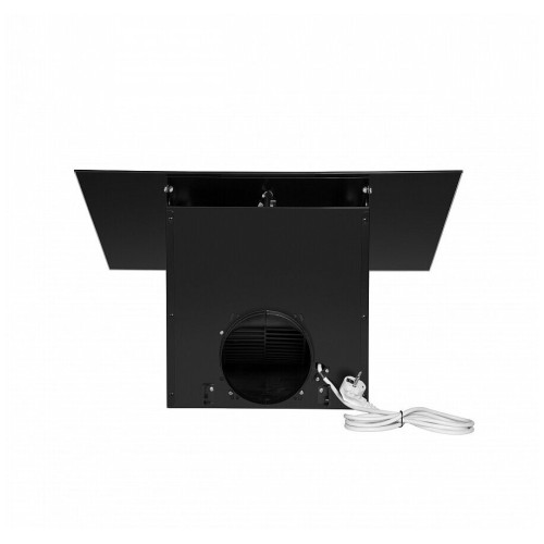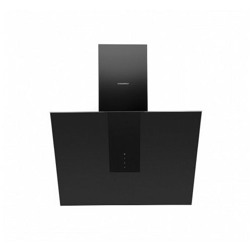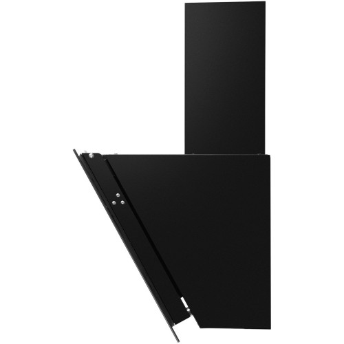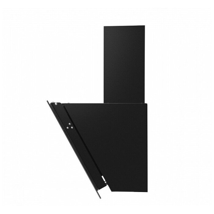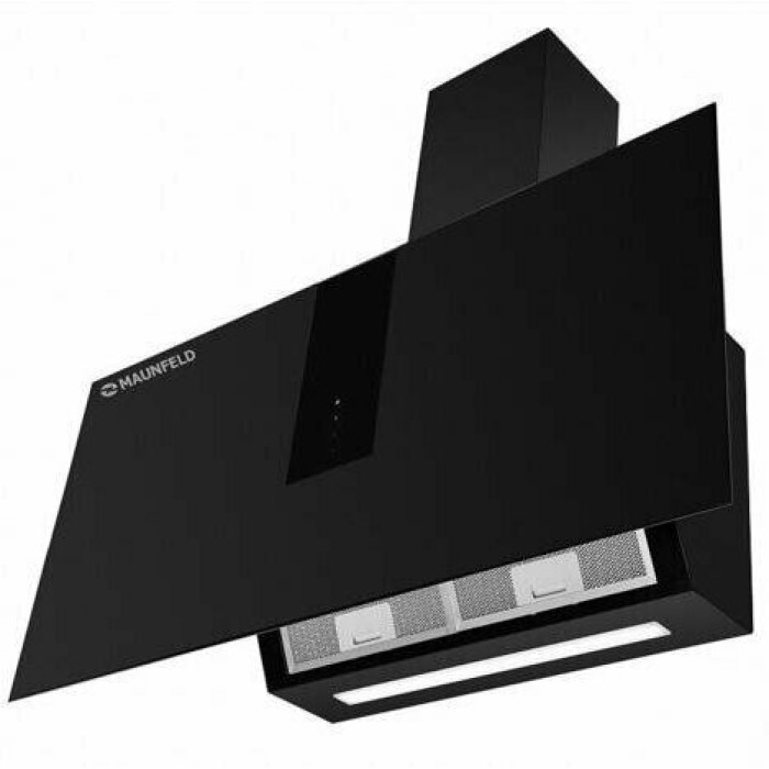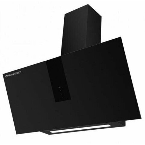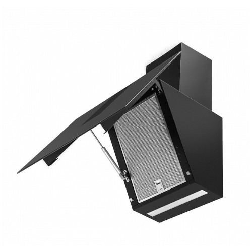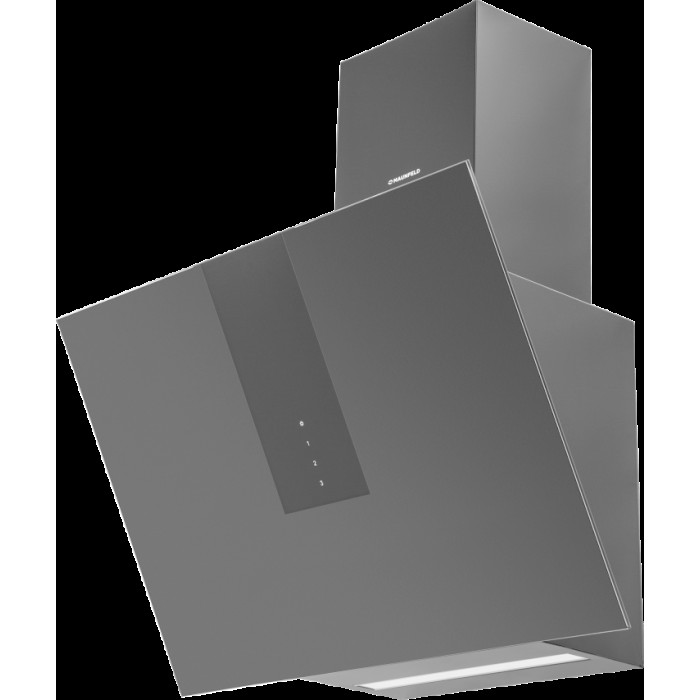 Стильная наклонная вытяжка шириной 60 см для большой кухни. Сенсорное управление позволяет выбрать режим работы и установить таймер.
