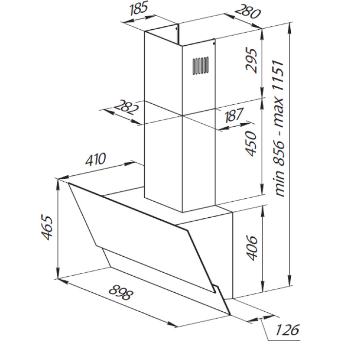 материал панели: закаленное стекло; количество ламп освещения: 2; мощность каждой лампы: 2 Вт; угольный фильтр KF-ES (приобретается отдельно); переходник 120−150; цвет короб: черная эмаль; коллекция Hi-Tech