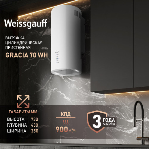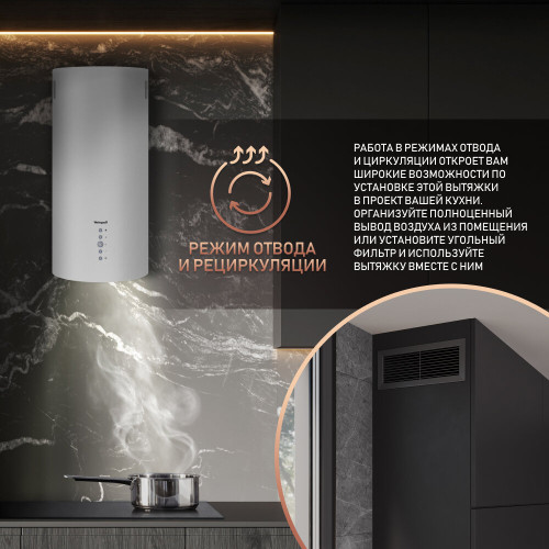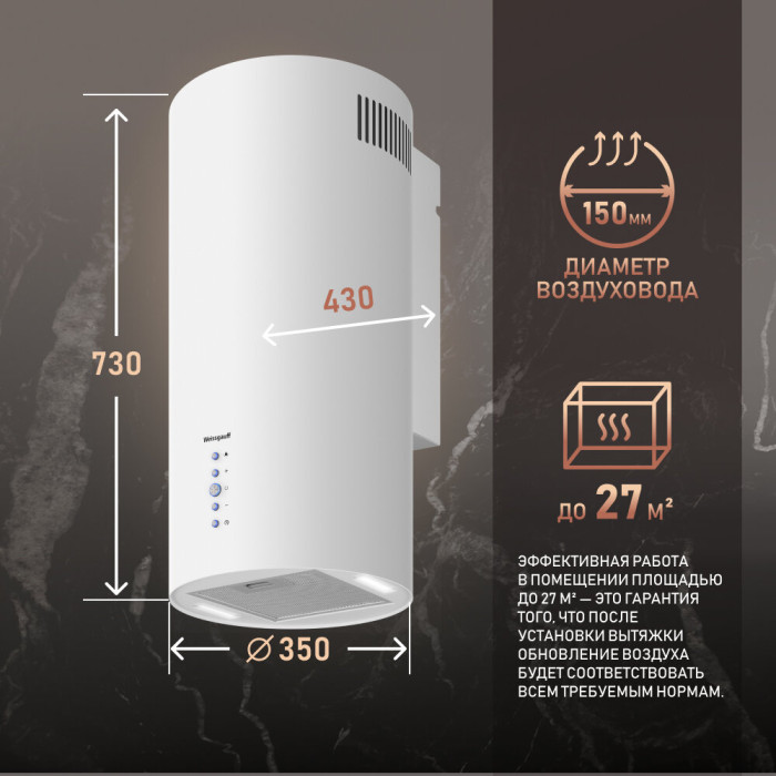 Производительность 900 м3/ч, Эффективная работа в помещении площадью до 27 м2, Низкий уровень шума 42 дБ, Интегрированное освещение, Возможность установки угольного фильтра