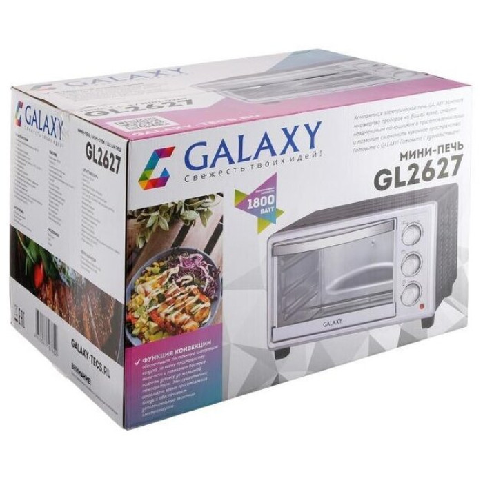 Мини-печь GL2627, серебристый мощность 1800 Вт, объем 25 л,6 режимов работы духовки, дверца из жаропрочного стекла, регулировка температуры духовки от 100 °С до 250 °С, внутренняя подсветка, функция конвекции, индикатор работы духовки, внутреннее п