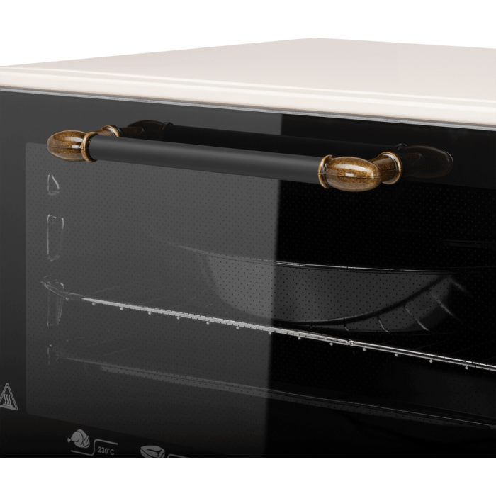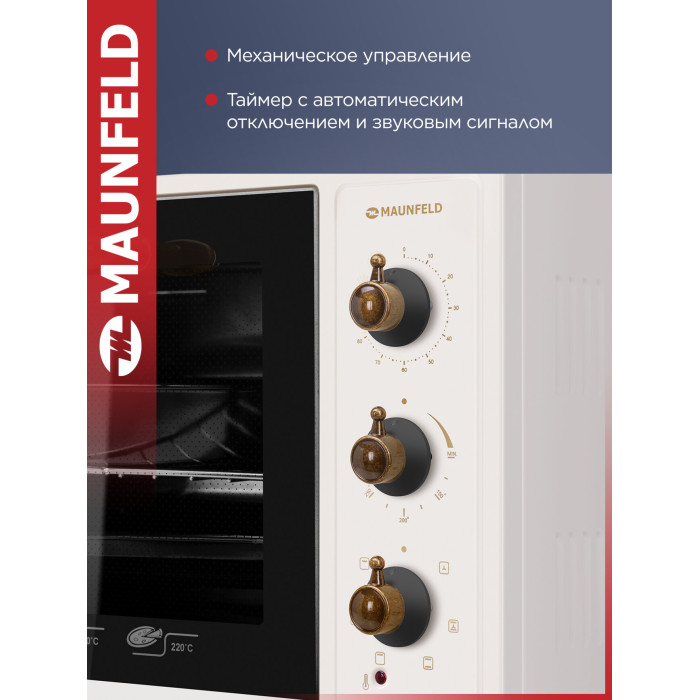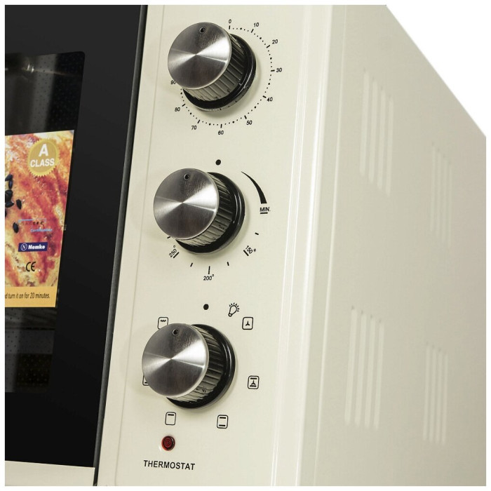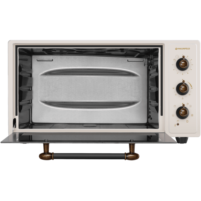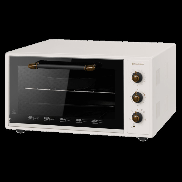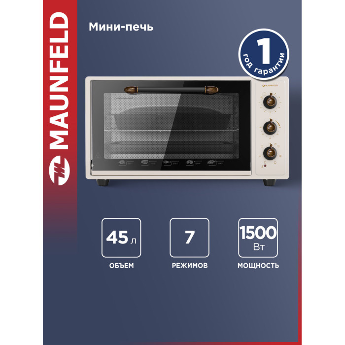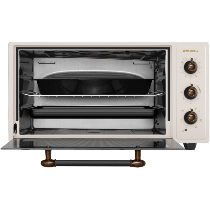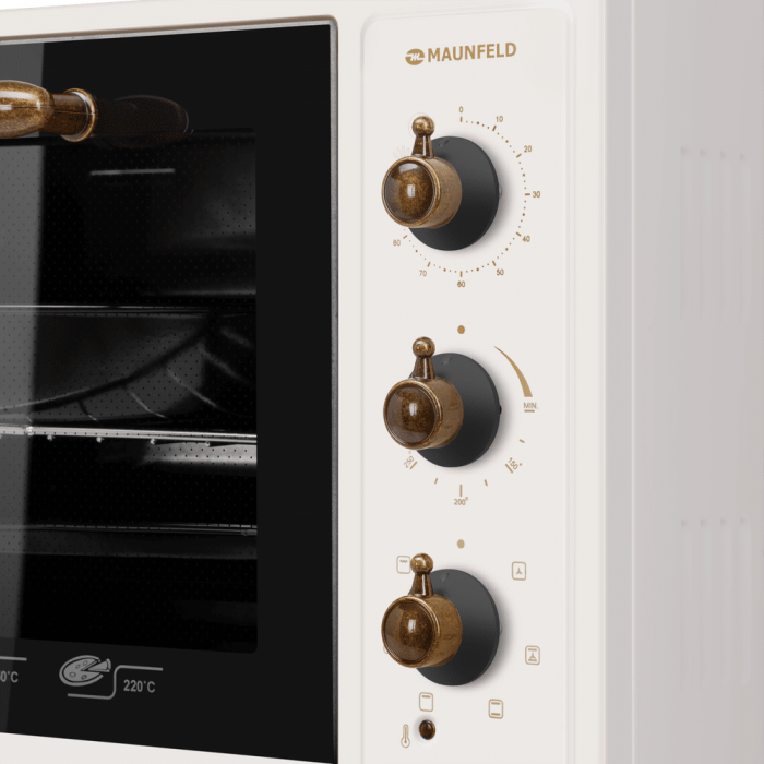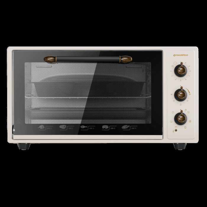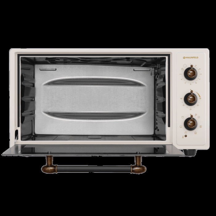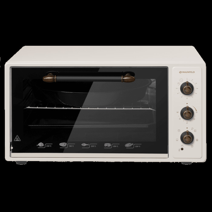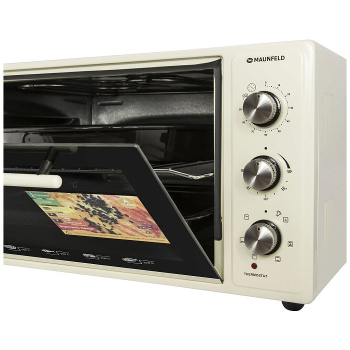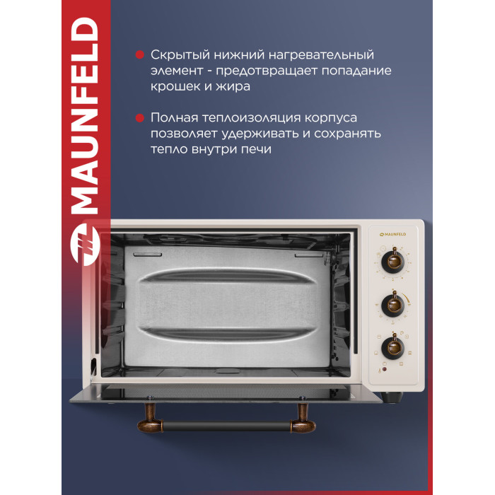 7 режимов работы, звуковой сигнал, индикатор термостата, скрытый нижний нагревательный элемент, автоотключение, эмаль лёгкой очистки, механизм легкого съема дверцы, полная теплоизоляция корпуса, уплотнитель стеклянной дверцы, защитное крепление из металла для стекла, широкое термостойкое стекло, плотное крепление нагревательных элементов, нагревательные элементы из нерж. стали; количество противней в комплекте: 2