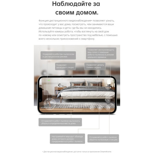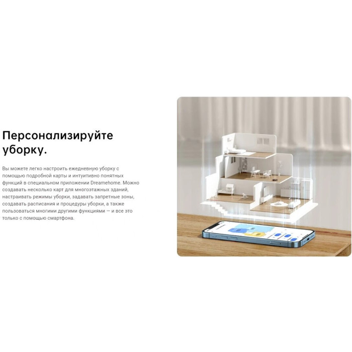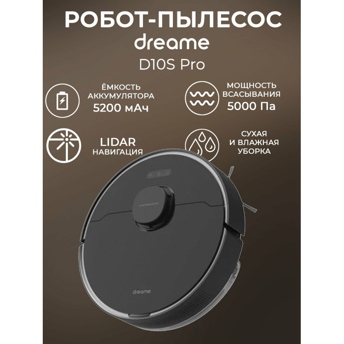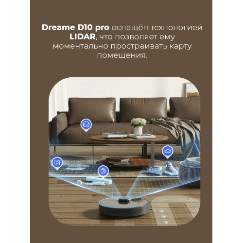 Dreame Bot D10s Pro - робот-пылесос с современной LDS навигацией и тщательной уборкой (сухой и влажной) на всех типах поверхностей. Камера Al Action для безупречного ориентирования. Управление через приложения Mi Home или Dreame Home позволяет полностью контролировать состояние и процесс уборки. Время автономной работы составляет 160 минут. D10s Pro работает на Proфессиональном уровне. Превосходное всасывание 5000 Па Dreame D10s обеспечивает высокую мощность всасывания 5000 Па для быстрого удаления пыли и грязи благодаря бесщеточному двигателю Nidec и оптимизированной конструкции воздуховода. Есть 4 уровня мощности всасывания. Лазерная навигация Робот-пылесос Dreame D10s Pro имеет лазерную LiDAR навигационную систему, который сканирует окружающее пространство на 360°. При первой уборке формируется карта вашего дома, которой впоследствии Вы будите управлять. Уборка 2-в-1: сухая и влажная Dreame D10s Pro способен мыть и пылесосить одновременно. Он оснащен многоразовыми салфетками для влажной уборки и поддерживает 3 уровня подачи воды. Деликатный Робот D10s Pro точно распознает препятствия с помощью камеры Al Action, например столы и стулья, и объезжает их, а также определяет места, в которых есть риск падения. Это позволяет роботу избежать застревания или ситуаций, в которых может потребоваться помощь хозяина. Вам достаточно просто запустить робот, а дальше он все сделает сам. Усовершенствованные алгоритмы 3D-сканирования на основе структурированного света обеспечивают интеллектуальное распознавание препятствий, которое позволяет избегать возникновения опасных ситуаций и выполнять уборку автономно. Расширенные интеллектуальные возможности Карты позволяют быстро оптимизировать маршруты уборки и добиться потрясающих результатов уборки в домах небольшого и среднего размера. Интеллектуальная система навигации с технологией LiDAR обеспечивает быстрое составление карты, а аккумулятор большой емкости на 5200 мАч позволяет выполнять уборку в течение длительного времени. Можно сохранять многоуровневые карты и использовать их для настройки предпочтительных параметров очистки или просмотра в автономном режиме путем восстановления хронологических карт в приложении. Превосходный результат Возможности глубокой очистки Dreame Bot D10s Pro и высокая мощность всасывания для сухой уборки позволяют получать превосходные результаты при удалении шерсти, грязи, пыли и мусора с ковровых покрытий, что может оказаться особенно полезным для владельцев домашних питомцев. Мощность всасывания до 5000 Па и резиновая щетка с защищенной от засорения конструкцией, облегчающей ее очистку от шерсти и волос, обеспечивают эффективное отделение пыли от поверхности и удаление грязи, для хранения которых предусмотрен мусоросборник емкостью 570 мл. Распознает ковер Робот Dreame Bot D10s Pro распознает ковры и ковровые покрытия и автоматически увеличивает мощность всасывания.