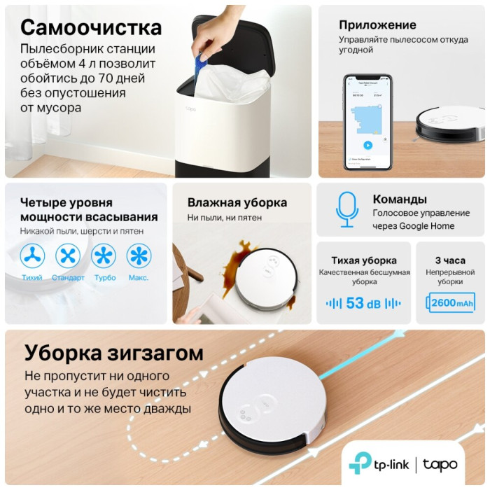 Робот-пылесос TP-Link Tapo RV10 Plus - это современное устройство, которое сочетает в себе функции сухой и влажной уборки. Он оснащен автоматической станцией самоочистки, что делает его удобным и практичным в использовании.