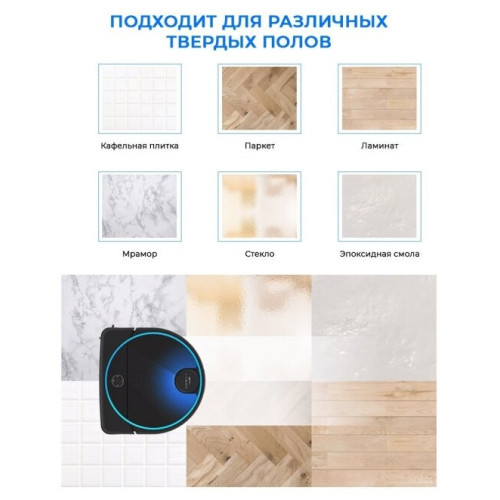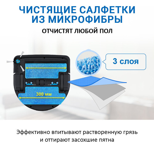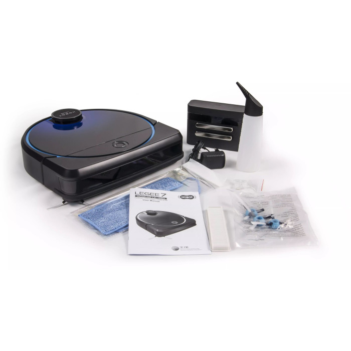 Площадь уборки до 240 кв.м; комплектация: зарядная база, 2 чистящие салфетки из микрофибры, HEPA-фильтр, 3 боковые щетки, адаптер питания, 4 форсунки, бутылочка для налива воды; FastBrush 4-этапная уборка; запись собственных голосовых оповещений; внесение запретных зон на карте; типы датчиков и сенсоров :лидар, гироскоп, датчик перемещения, электронный компас, система позиционирования, датчик угла поворота, датчик перепада высоты