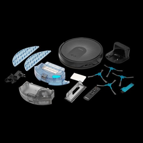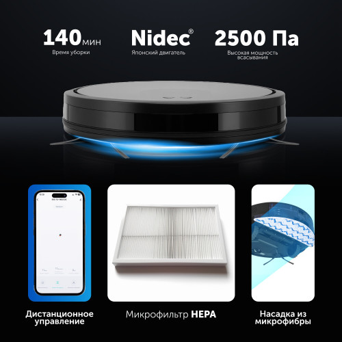 Комплектация-Количество насадок: 2, Насадки: Насадка из микрофибры, Зарядное устройство: Есть, Док-станция: Есть, Пульт ДУ: Есть, Объем резервуара для воды-0.85 л, Емкость аккумулятора-2600 мА*ч, Мягкий бампер-есть, Время зарядки-5.5 ч, Максимальный уровень шума-62 дБ, Максимальная потребляемая мощность-25 Вт, Зарядка-Док-станция, Тип батарей пульта ДУ-2хAAA, Напряжение аккумулятора-14.8 В, Фильтры-Фильтр тонкой очистки: HEPA, УФ-Лампа: Есть, Ориентация в пространстве-ИК-датчики, Количество датчиков-18, Тип аккумулятора-Li-Ion, Дистанционное управление-Есть, Максимальная мощность всасывания-2500 Па, Время работы-140 мин, Объем пылесборника-0.45 л, Количество режимов уборки-5, Установка на зарядное устройство-Автоматическая, Тип убираемой поверхности-Твердые поверхности, Режимы уборки-Автоматическая, Вдоль стены, Таймер включения-Есть, Создание расписания уборки-На 7 дней, Управление с помощью смартфона-Есть, Работает в системе "Умный дом" -Есть, Тип пылесборника-Контейнер, Индикация включения-Есть, Возможность управления с пульта ДУ-Есть, Обнаружение препятствий-Есть, Составление плана помещения-Есть, Сигнал при застревании-Есть, Тип датчиков-Инфракрасные, Оптические, Прорезиненные колеса-Есть, Боковые щетки-Есть, Доставка по России-1, Тип управления-электронное, Функции-Сухая уборка, Влажная уборка, Голосовое оповещение, Поддержка Wi-Fi-есть, Цвет-Черный.