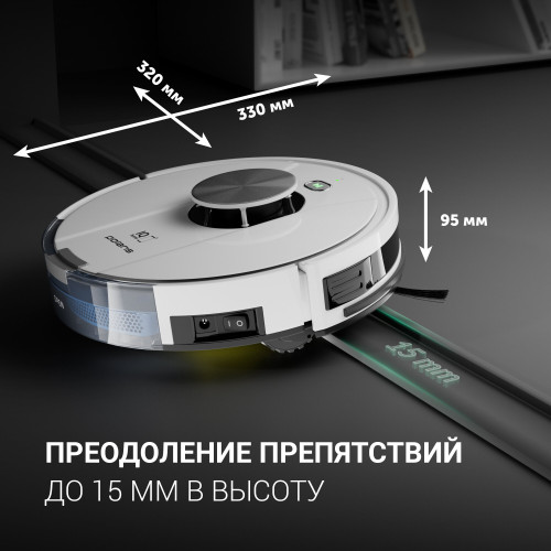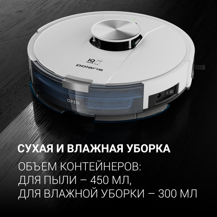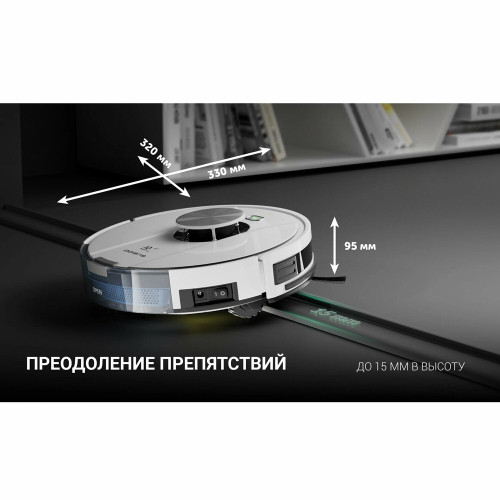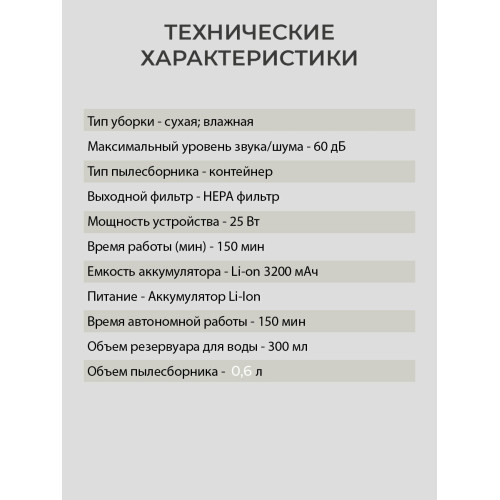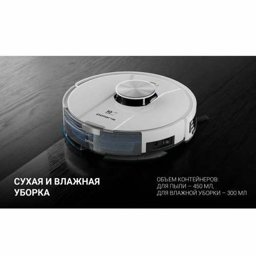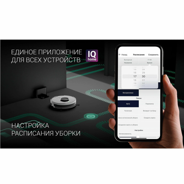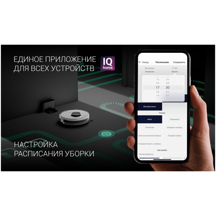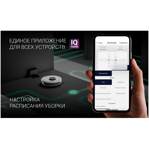 тип уборки: влажная, сухая, объем контейнера для пыли: 0.45 л, время работы от аккумулятора: 150 мин, Экосистема Умного дома: IQ Home, Умный дом Яндекса, управление со смартфона, Возможность управления с пульта ДУ, тип датчиков: инфракрасные, установка на зарядное устройство: автоматическая, фильтр тонкой очистки, ширина: 33 см, высота: 9.50 см, глубина: 33 см