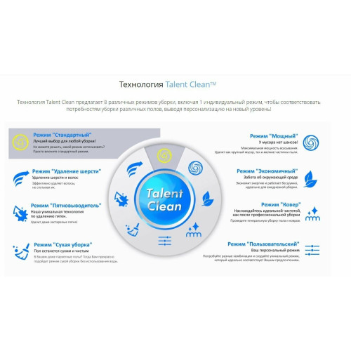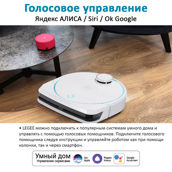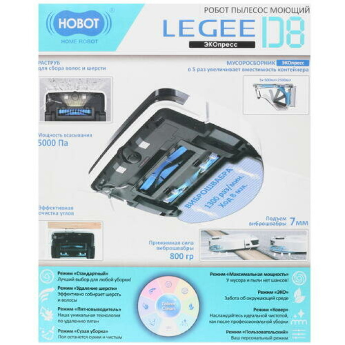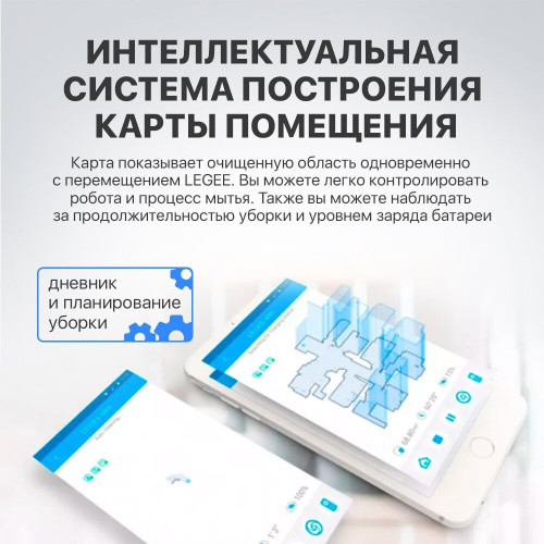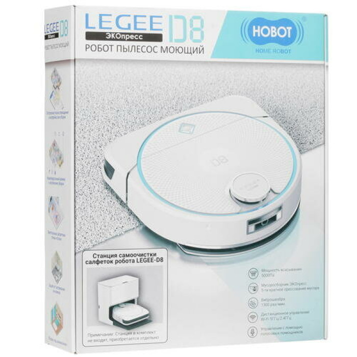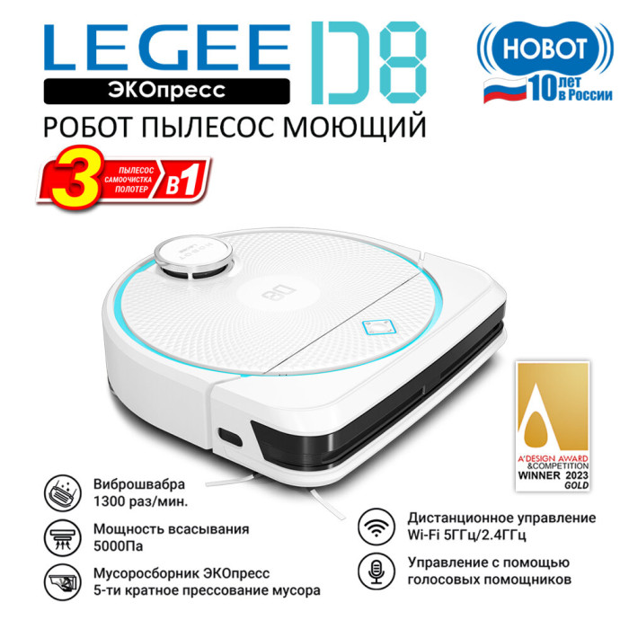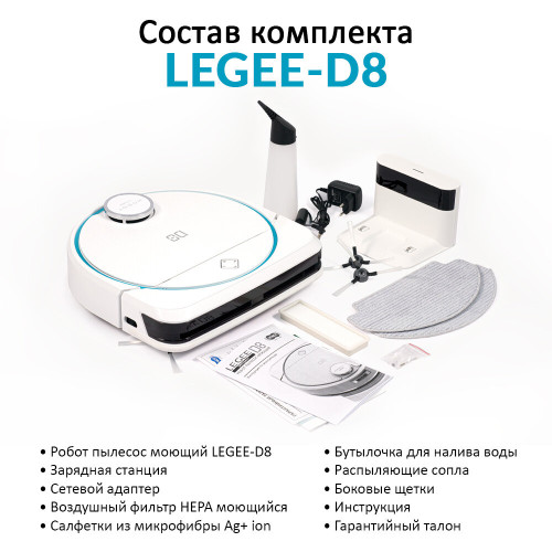 *станция LuLu не входит в комплект робота и продается отдельно (будет доступна к продаже во втором полугодии 2023 года) ** проверено в лабораторных условиях при площади помещения 50м2 при частоте уборки не более 2-3 раз в неделю Tangless Suction 4 in 1 Система 4-х ступенчатой очистки Благодаря новой функции Tangless Suction 4 в 1 LEGEE выполняет одновременную 4-х ступенчатую очистку: пылесосит волосы и шерсть с помощью переднего раструба, подметает ковры и мусор с помощью турбощетки для тщательной уборки, распыляет воду и моет пол салфеткой при помощи виброшвабры с прижимным усилием 800г! раструб для сбора волос И шерсти Защита от запутывания на турбощетке Уникальная разработка инженеров компании новот. Передний раструб расположен перед турбощеткой и собирает длинные волосы и шерсть, исключая наматывание на турбощетку. Эта функция значительно облегчает обслуживание и увеличивает срок службы узлов робота. LEGEE-D8 проводит глубокую очистку ковровых и напольных покрытий, отключая разбрызгивание воды и подняв швабру. Когда LEGEE чистит область ковра, скорость движения замедляется, мощность пылесоса увеличивается, а турбощетка вращается быстрее, тщательно собирая весь мусор, находящийся глубоко в ковровом покрытии. турбощетка для очистки ковров И стыков Ширина турбощетки 180 мм Турбощетка имеет щетинисто-лепестковую конструкцию, которая намного лучше производит глубокую очистку любых напольных покрытий и стыков между ними, по сравнению с силиконовыми щетками. А передний раструб соберет более 90% волос и шерсти, исключая их наматывание на щетку. мусоросборник ЭКОпресс 5-кратное увеличение вместительности Мусоросборник снабжен моющимся HEPA -фильтром. Уникальная система ЭКОпресс уплотняет мусор в контейнере, что позволяет увеличить время работы без необходимости очистки мусоросборника до 5 раз. Заменяет станцию самоочистки мусорного контейнера. Экономия на покупке мусорных мешков. Отсутствие фактора запыляемости помещения при самоочистке на станциях без HEPA- фильтров. отлично убирает В углах D-образная форма корпуса + боковая щетка 4 см Благодаря D-образной форме LEGEE эффективно убирает в углах, а боковая щетка, выступающая на 4 см от корпуса, помогает выметать весь мусор из углов, труднодоступных мест и вдоль плинтусов. виброшвабра для тщательного удаления грязи Частота вибрации 1300 раз в минуту Виброшвабра LEGEE-D8 повторяет движение руки человека для оттирания засохших пятен. Салфетка из микрофибры собирает и удерживает грязь на передней части, благодаря чему на полу не останется разводов. Круглые вращающиеся салфетки у других производителей роботов, напротив, разносят грязь во время вращения. Круглые салфетки требуют более частой стирки и ухода для сохранения своих моющих способностей. смарт-механизм для подъема платформы С чистящей салфеткой Поднимается на 7мм от пола Чистящая салфетка с подъемным смарт-механизмом может подниматься на 7 мм над поверхностью пола. LEGEE-D8 с легкостью заезжает на ковры и переезжает межкомнатные пороги, а по окончании уборки, поднятая влажная салфетка не испортит чувствительные к влаге напольные покрытия. высокая проходимость Преодолевает пороги до 20 мм LEGEE с легкостью производит уборку на ковровых покрытиях. Уборка полностью под контролем! В приложении есть функция «Ослабить лазание» для определенной зоны или всего помещен