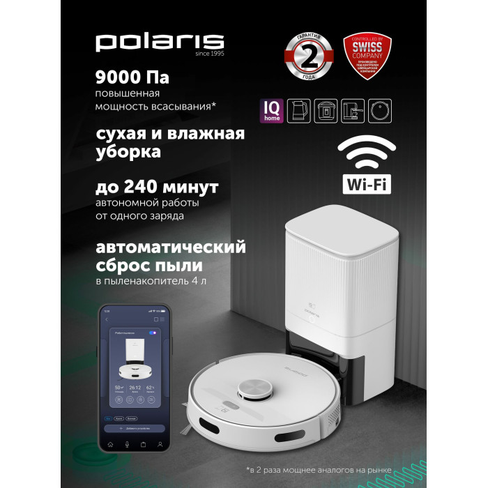 Адаптер - 1 шт., Боковая щётка - 2 шт., Гарантийный талон - 1 шт., Губчатый фильтр - 1 шт., Зарядная база - 1 шт., Инструкция полизователя - 1 шт., Мешок для пыли - 2 шт., Микрофибра - 2 шт., Робот-пылесос Polaris PVCRDC G2 6002 WIFI IQ Home - 1 шт., Упаковка-коробка - 1 шт., Фильтр НЕРА - 2 шт., Щёточка для очистки - 1 шт.