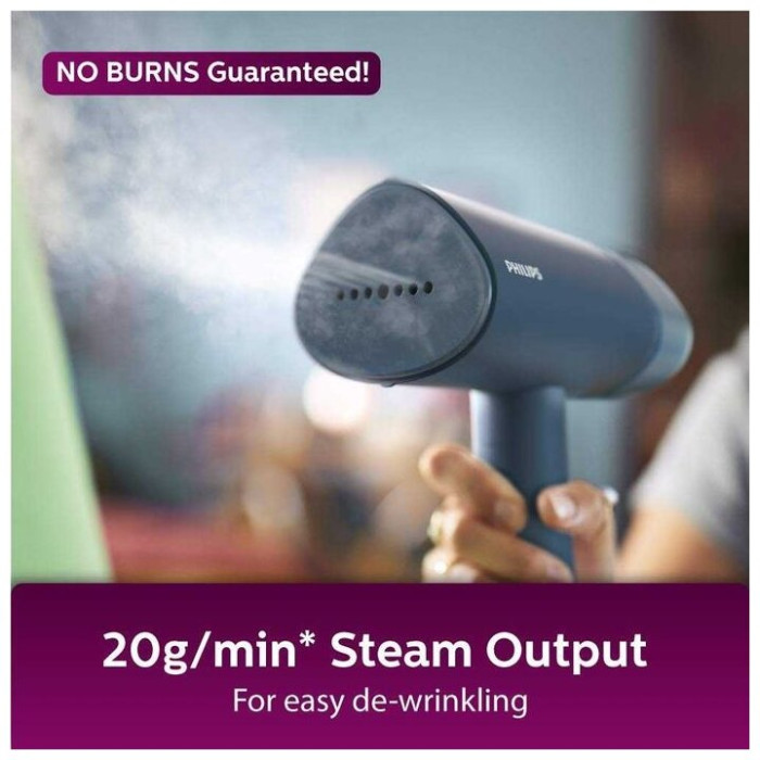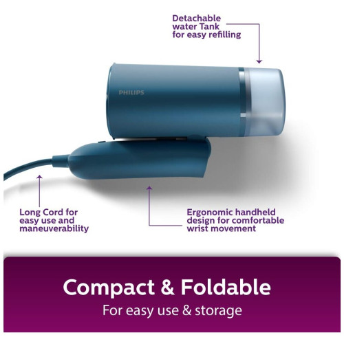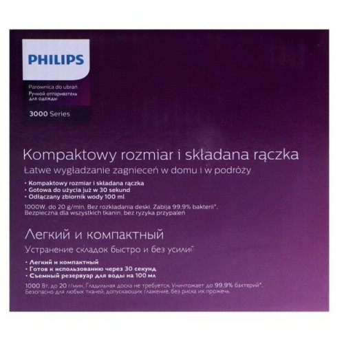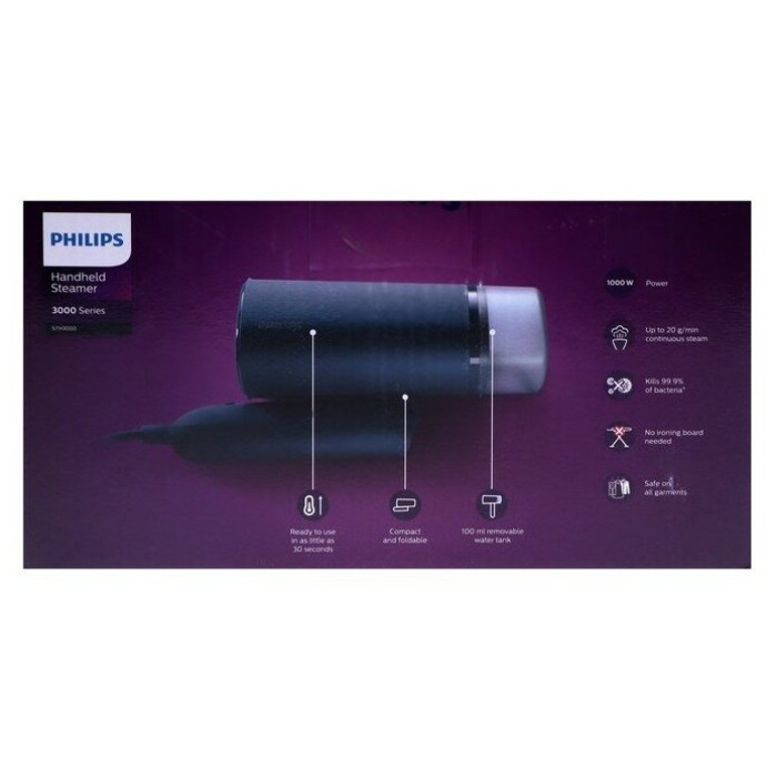 Отпариватель PHILIPS STH3000/20 предназначен для разглаживания одежды в домашних условиях или в путешествии. Время подготовки к работе составляет 30 секунд. Оснащён съёмным резервуаром для воды объёмом в 100 мл. Подходит для всех типов тканей. Особенности Световой индикатор отпаривания Складная конструкция для удобного хранения Длинный шнур в 2 метра для комфортного использования Цвет|Синий; Мощность, Вт|1000; Объём резервуара для воды, л|0.1; Длина шнура, м|2; Мощность подачи пара, г/мин|20; Гарантийный срок, мес.|24; Время нагрева, сек|30; Объём резервуара для воды, мл|100; Вид отпаривателя|Ручной;