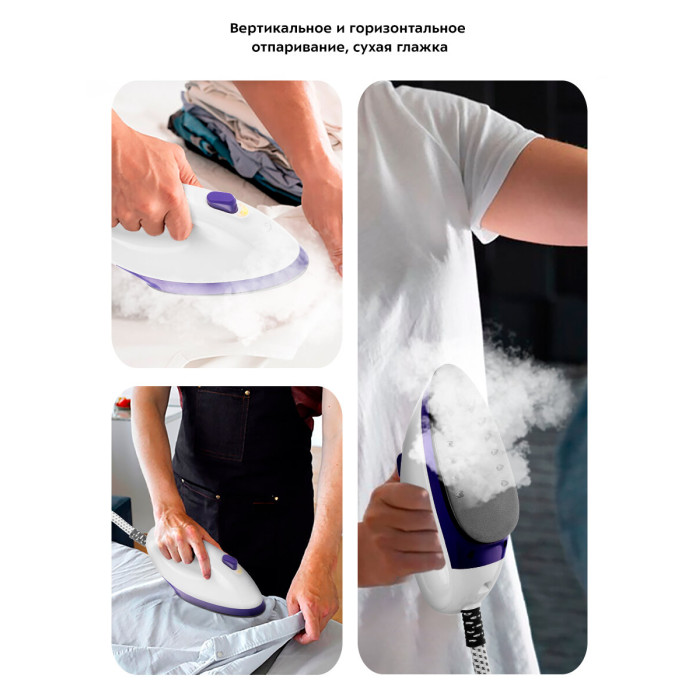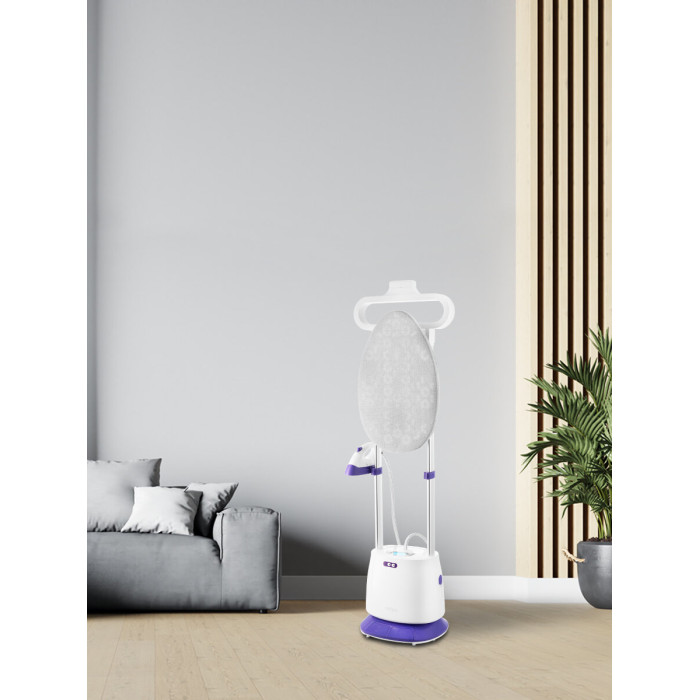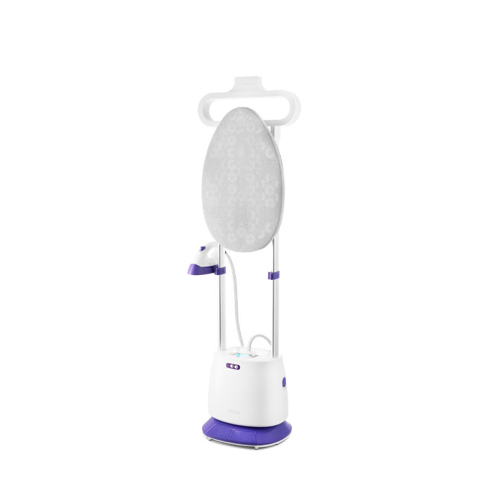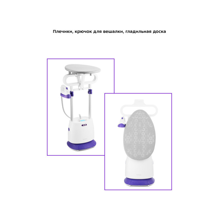 Комплектация 1. Отпариватель с паровым шлангом и утюжком — 1 шт. 2. Гладильная доска — 1 шт. 3. Горизонтальная планка с фиксаторами гладильной доски — 1 шт. 4. Плечики — 1 шт. 5. Телескопическая стойка — 2 шт. 6. Резервуар для воды — 1 шт. 7. Держатель утюжка — 1 шт. 8. Защитная варежка — 1 шт.