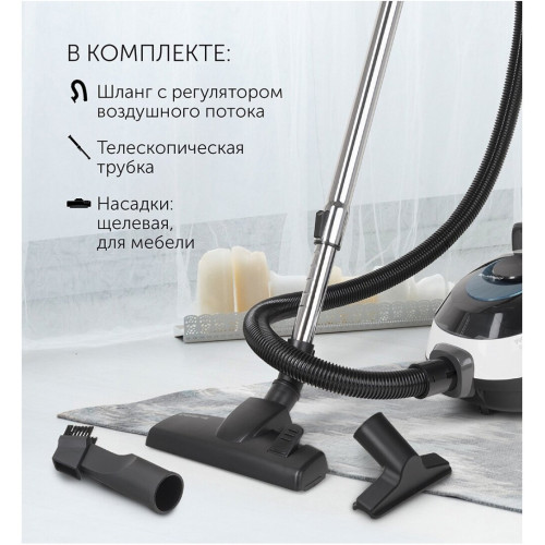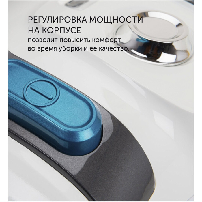 индикатор заполнения пылесборника, место для хранения насадок, ножной переключатель вкл./выкл., регулятор мощности на корпусе