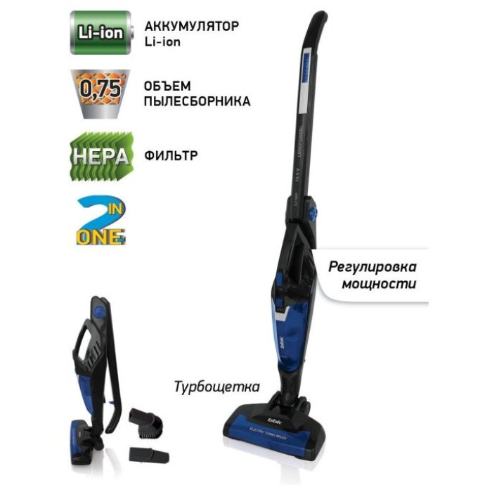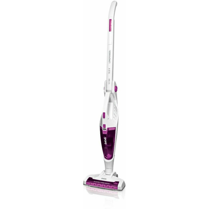 Вертикальный беспроводной пылесос 2-в-1 без мешка для сбора пыли BV2526 – современное, универсальное и удобное решение задачи уборки помещения. Благодаря литий-ионному аккумулятору и компактным размерам пылесос можно использовать как для удаления пыли с мягкой мебели, ковров, занавесок, книжных полок, компьютеров и т. д, так и для чистки, например, салона автомобиля. Система фильтрации с применением HEPA-фильтра обеспечивает максимальную задержку частиц пыли внутри пылесоса, подставка док-станция со складной ручкой дает удобство использования и компактность хранения, а электрическая турбо-щетка и комплект насадок – эффективность и легкость уборки. Подсветка области уборки не оставит незамеченной любую пыль и грязь, а набор сменных насадок позволят убрать загрязнения с любых поверхностей. Модель представлена в ярком бело-фиолетовом и черно-синем цветах.