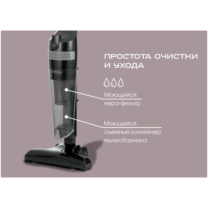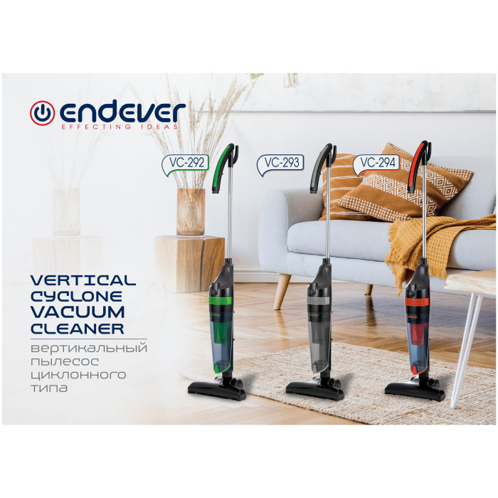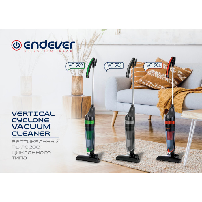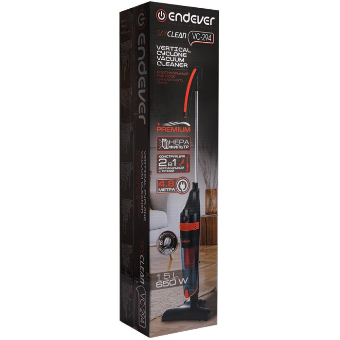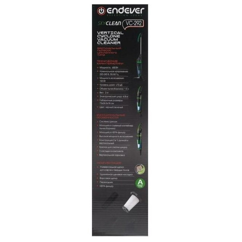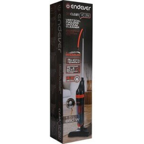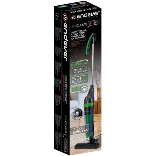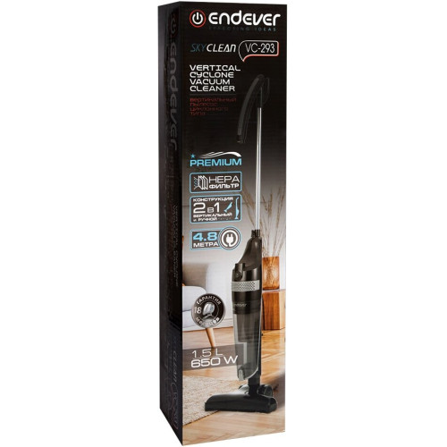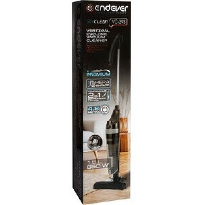 Вертикальный пылесос циклонного типа ENDEVER Skyclean VC-293 — это великолепный образец необычного дизайна в сочетании с мощностью и высоким качеством. Данный пылесос обладает мощность 650 Вт, которая благодаря системе циклон дает 120 Вт всасывающей мощности для очистки любой поверхности вашего дома. Контейнер пылесборника нашего вертикального пылесоса имеет объем 1,5л, чего хватит на несколько уборок подряд. К тому же контейнер съемный и его можно мыть, так же, как и HEPA фильтр, который идет в комплекте.