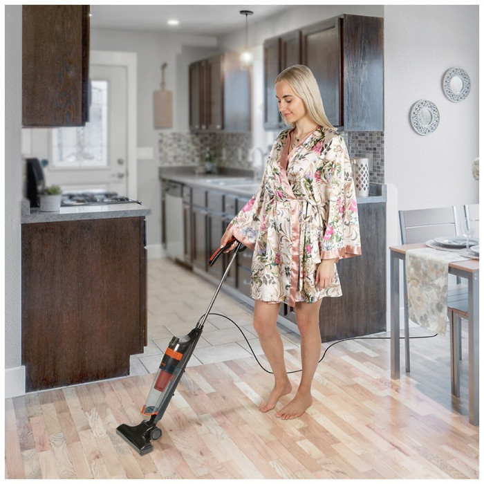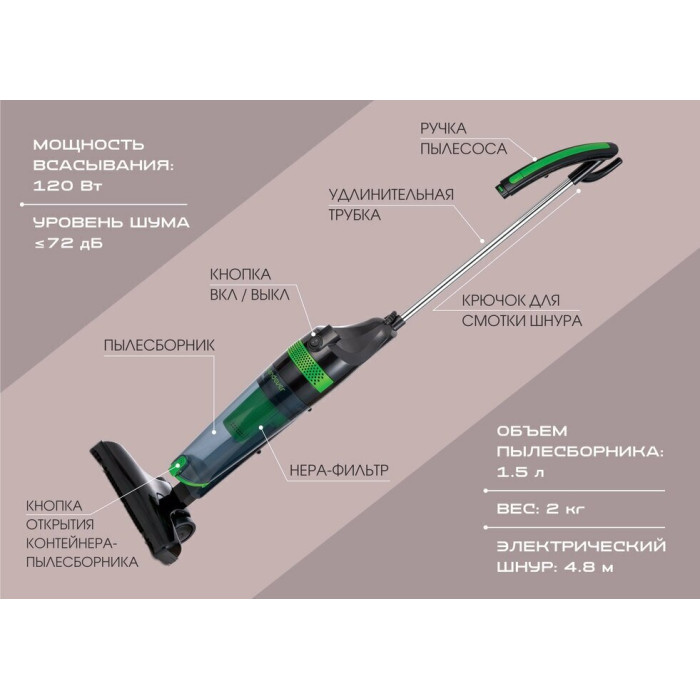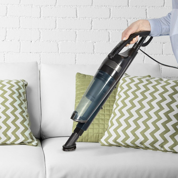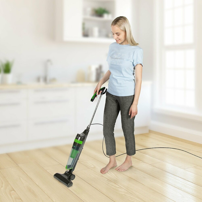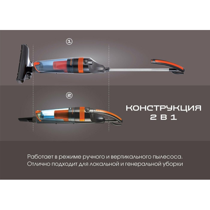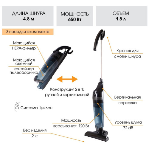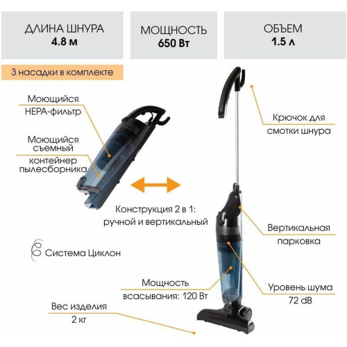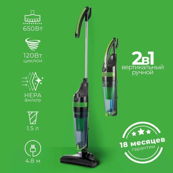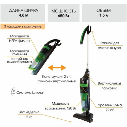 Вертикальный пылесос циклонного типа ENDEVER Skyclean VC-293 — это великолепный образец необычного дизайна в сочетании с мощностью и высоким качеством. Данный пылесос обладает мощность 650 Вт, которая благодаря системе циклон дает 120 Вт всасывающей мощности для очистки любой поверхности вашего дома. Контейнер пылесборника нашего вертикального пылесоса имеет объем 1,5л, чего хватит на несколько уборок подряд. К тому же контейнер съемный и его можно мыть, так же, как и HEPA фильтр, который идет в комплекте.