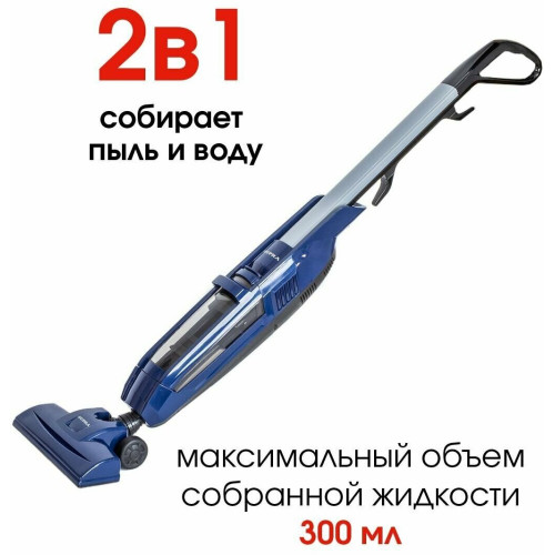 Тип - вертикальный | Потребляемая мощность - 600 Вт | Тип питания - от сети | Мощность всасывания - 150 Вт | Дополнительная информация - максимальный объем воды в контейнере: 0,3 л | Длина сетевого шнура - 4.5 м | Вес - 2.58 кг | Тип уборки - сухая | Тип пылесборника - контейнер | Цвет - синий | Насадки в комплекте - насадка-щетка для уборки пола и ковров | Объем пылесборника - 0.8 л | Дополнительные функции - функция сбора жидкостей | Особенности конструкции - вертикальная парковка | ШхВхГ - 18x110.40x26 см