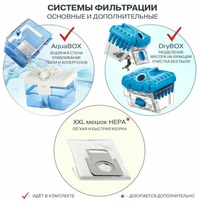 возможность работы с пылесборником DryBox (контейнер с сортировкой мусора на крупную и мелкие фракции) и Aqua-Box (сухая уборка с одновременной мойкой воздуха); объем резервуара моющего средства 1,8 л