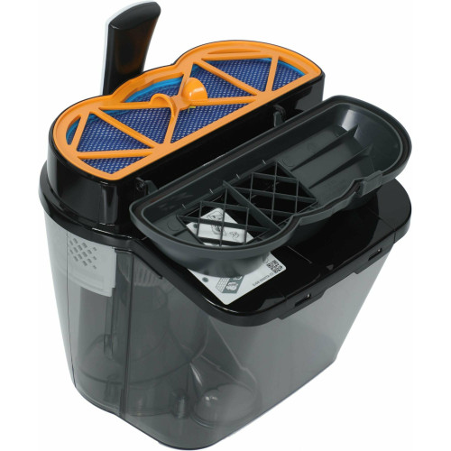 радиус действия 10м; фильтр НЕРА12; обрезиненные колеса; двухкамерный дизайн контейнера
