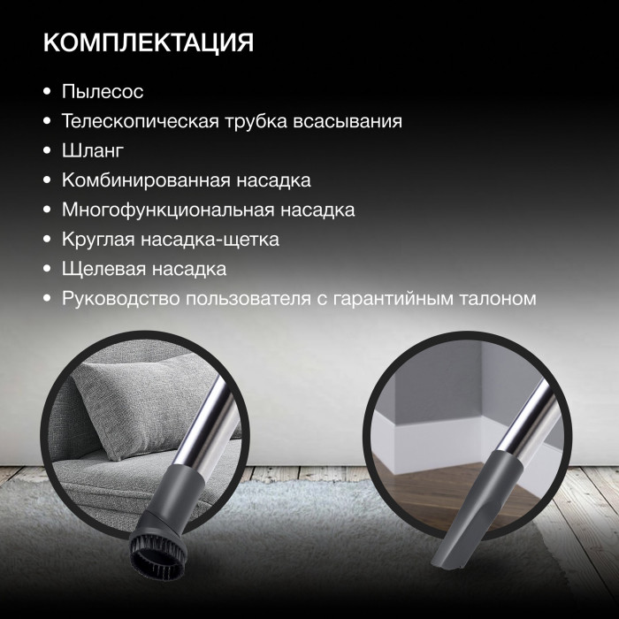 тип: традиционный пылесос, тип пылесборника: контейнер, тип уборки: сухая, мощность всасывания: 380 Вт, потребляемая мощность: 2400 Вт, дополнительные функции: автоматическое сматывание шнура, труба всасывания: телескопическая, комплектация: насадка для мягкой мебели, универсальная насадка для сухой уборки, щелевая насадка, фильтр тонкой очистки, объем пылесборника: 5 л, уровень шума: 88 дБ, вес: 8.57 кг, длина сетевого шнура: 5 м