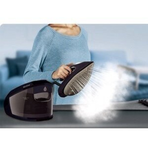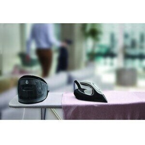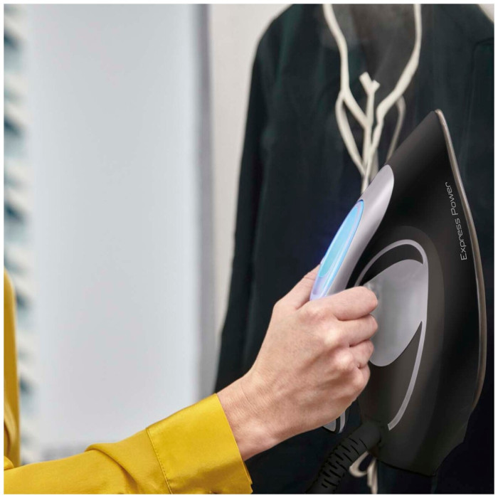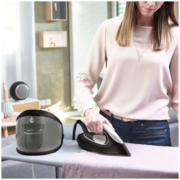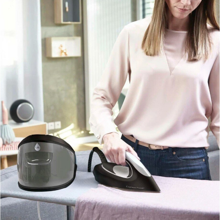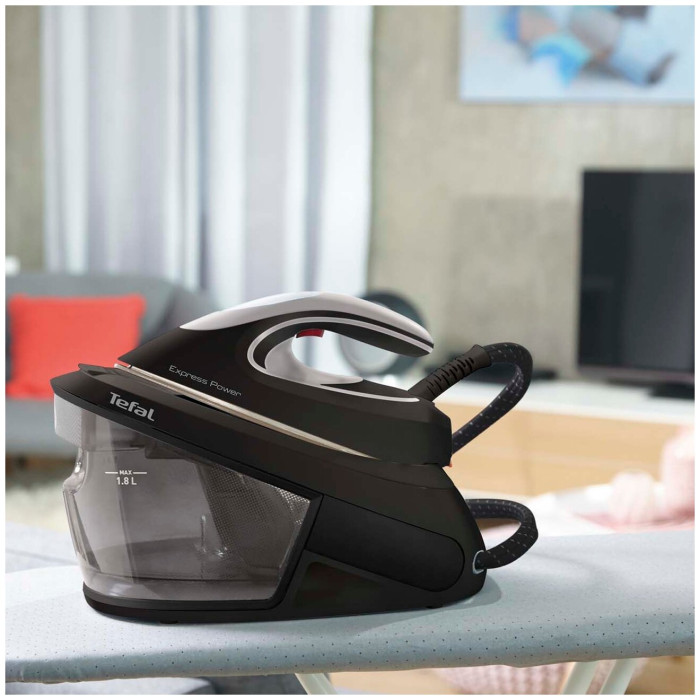 Парогенератор Tefal Express Power SV8062E0 оптимален для обработки ткани разных видов. Высококачественное основание утюга, созданное по технологии Durilium Airglide Autoclean, характеризуется легкостью скольжения и устойчивостью к царапинам. Подошва не подвержена окислению, обладает антипригарными свойствами и функцией самоочистки. Опция вертикальной обработки и паровой удар мощностью 450 г/мин позволят эффективно удалить даже глубокие складки на деловом костюме, вечернем платье или шторах. Резервуар для воды парогенератора Tefal Express Power SV8062E0 имеет оптимальный объем, равный 1,8 л. В функционале устройства есть возможность использования нефильтрованной жидкости, что облегчает эксплуатацию модели. Парогенератор способен самостоятельно настраивать рабочую температуру в зависимости от выбранного типа ткани. За защиту от накипи отвечает специальный коллектор, который удерживает известковый налет. Удобство хранения и транспортировки модели обеспечивает возможность фиксации устройства на базовой станции.