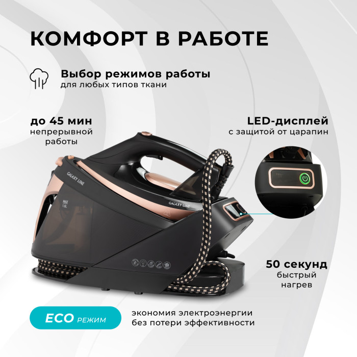 защита от накипи, паровой удар, регулировка подачи пара, система самоочистки, экорежим