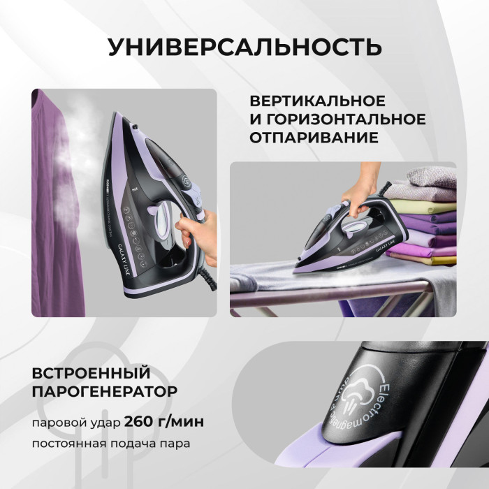 паровой удар, регулировка подачи пара, регулировка температуры, сигнал автоотключения, система самоочистки, сухая глажка, функция разбрызгивания