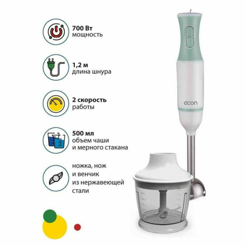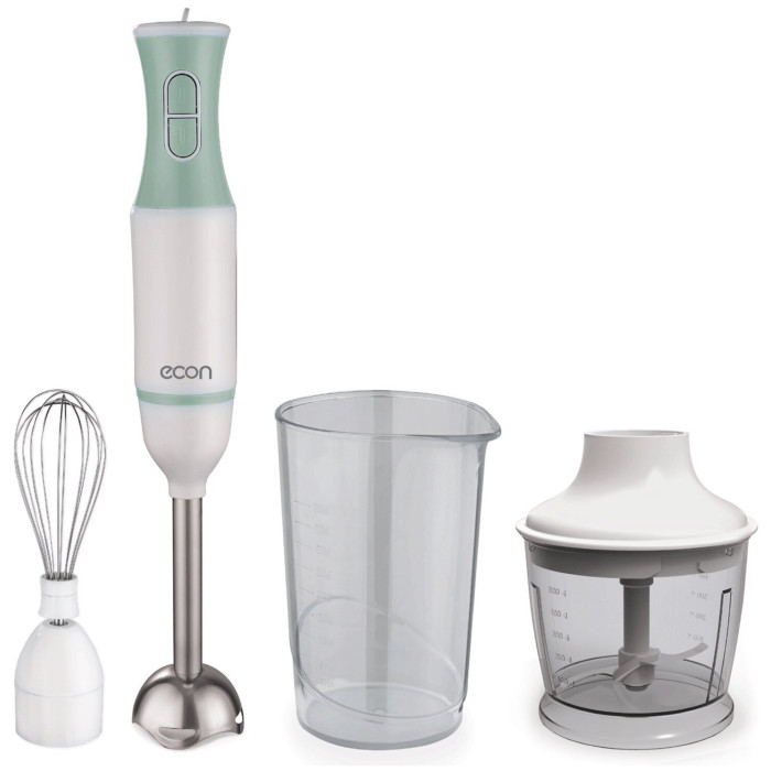 Блендер погружной ECON ECO-432HB белый. Блендер Econ ECO-432HB представлен в пластиковом белом корпусе с удобной для удержания конструкцией. Погружная часть произведена из устойчивого к деформированию металла. Комплектация дополнена с венчиком для взбивания, удобным мерным стаканом на 0.5 л, эффективной насадкой блендером и чашей для измельчения на 500 мл.