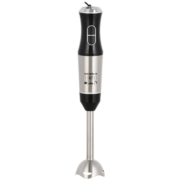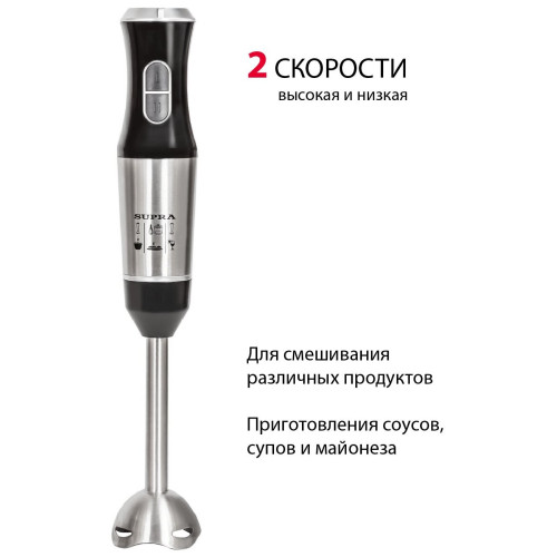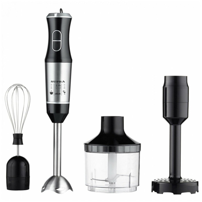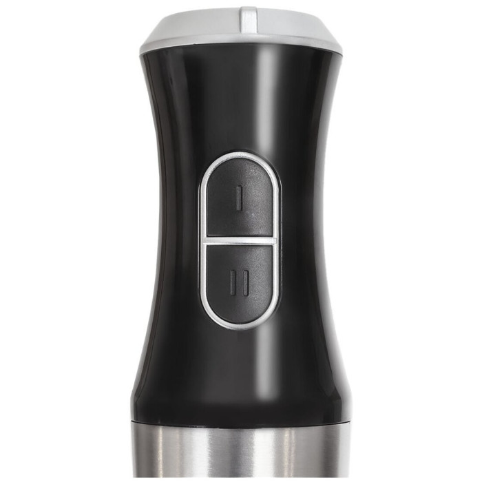 Мощность - 800 Вт. Количество скоростей - 2. Плавная регулировка скорости. Материал погружной части - нержавеющая сталь. Комплектация: блендер, съемная насадка-венчик, насадка для приготовления пюре, измельчитель 500 мл. Материал корпуса - пластик, металл. Цвет - черный с серебристым.