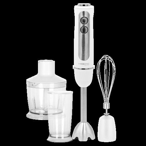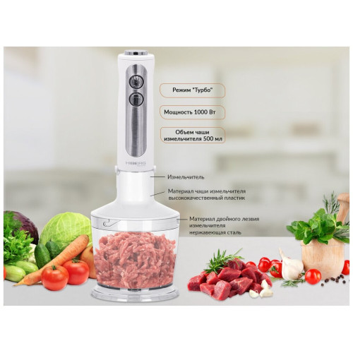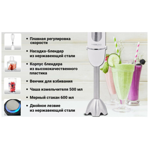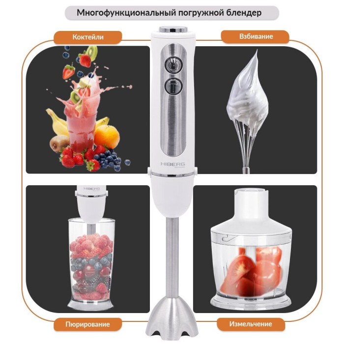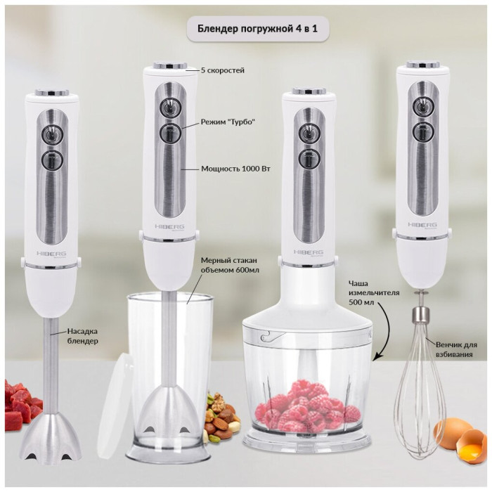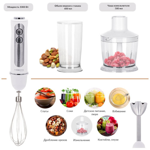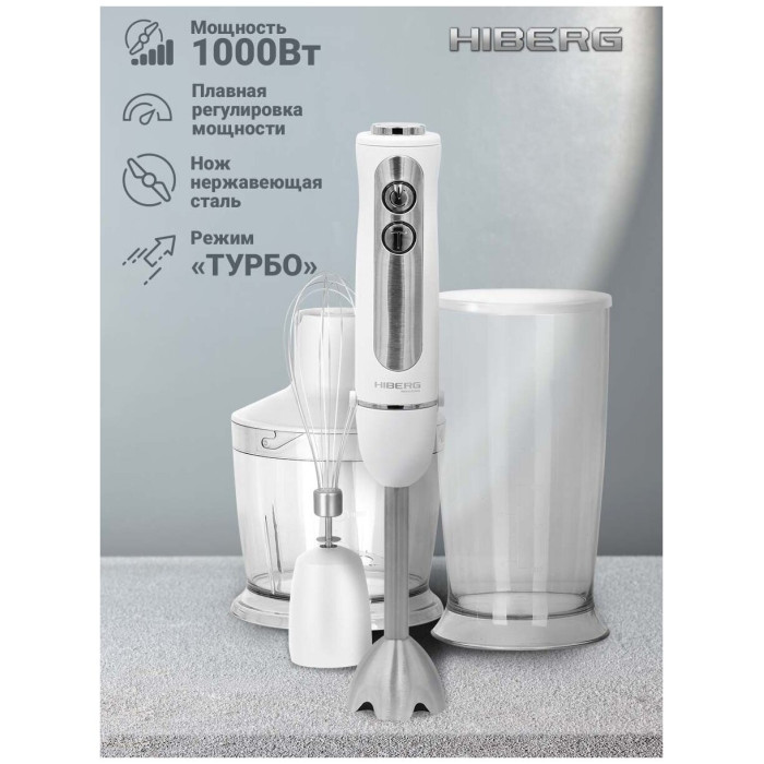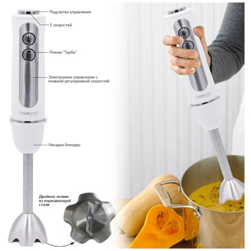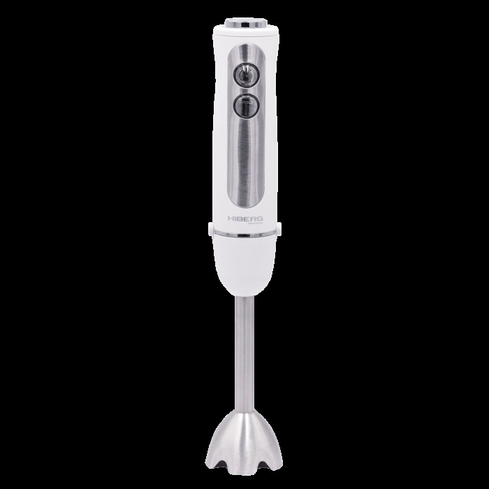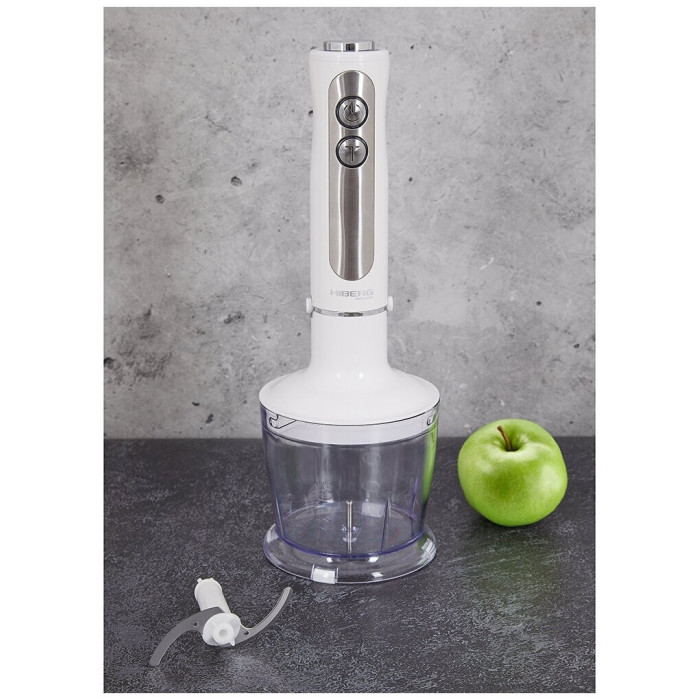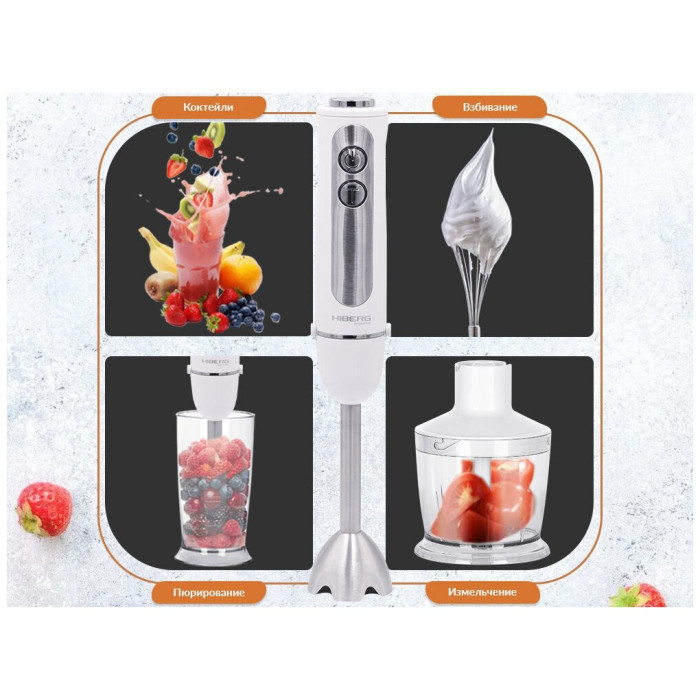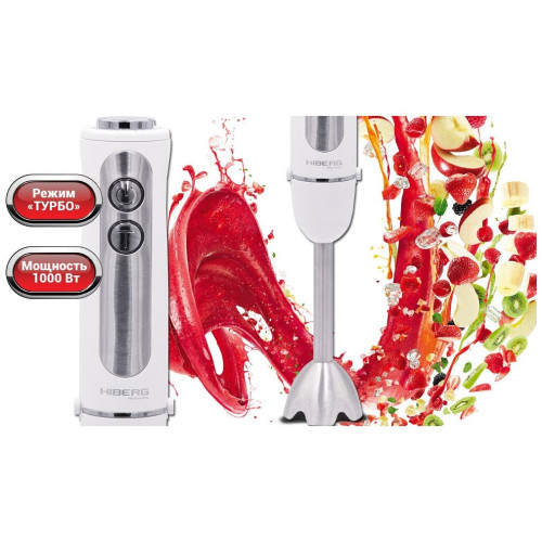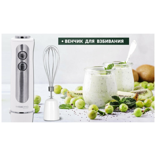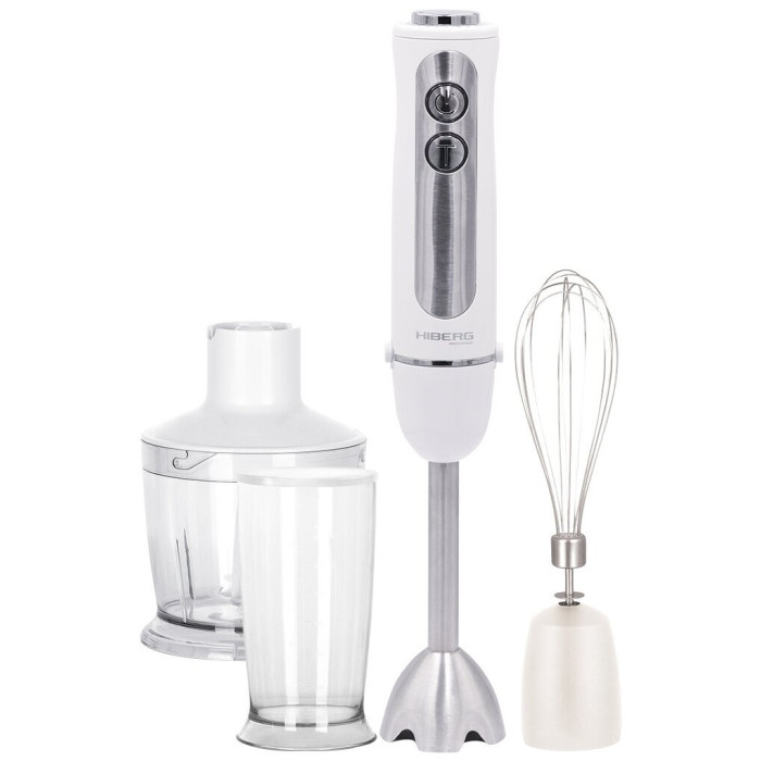 Погружной блендер HIBERG с мощностью 1000 Вт и турбо режимом, работает бесшумно и имеет 5 скоростей с функцией плавного переключения. За счет высокой мощности измельчает с легкостью даже орехи, чаша измельчителя объемом 500мл, позволяет смешивать и готовить соусы, майонез, паштеты и не только. Домашним блендером удобно пользоваться за счет прорезиненной рукоятки, а так же сменным прикручивающимся насадкам в комплекте не только для измельчения, а также венчик для взбивания и ёмкость объемом 600мл. Насадки изготовлены из пищевой нержавеющей стали, удобно моется и не требует дополнительного ухода. Модель эргономична и занимает мало место, а линейка цветов белый/бежевый/черный впишется в дизайн любой кухни. Купить блендер погружной можно и в качестве подарка для родных, близких, друзей, маме, жене и подруге. При этом повод значения не имеет, может быть день рождения, 8 марта, новый год и т. д Блендеры HIBERG - это мощные помощники на Вашей кухне! Блендеров миксеров HIBERG - разнообразен, подберите модель и цвет - подходящий именно для Ваших потребностей! Преимуществами блендеров HIBERG являются: - наличие электронного управления; - высокая мощность и надежность; - все механические части, контактирующие с продуктами изготовлены из материалов (металлов), допущенных сертификационными органами для применения к пищевому производству; Выбирай блендеры HIBERG - выбирай премиальное качество!