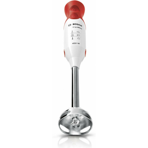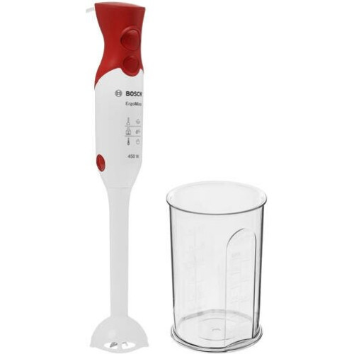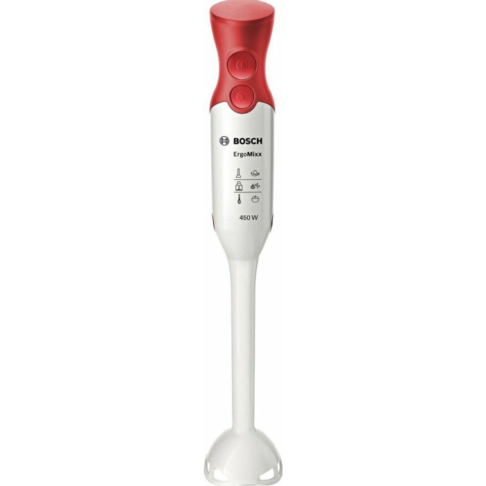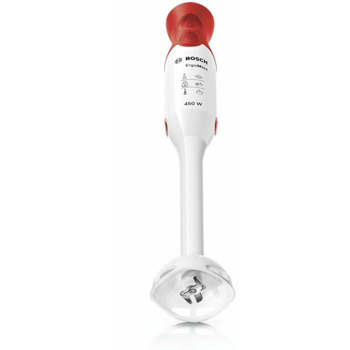 Погружной блендер Bosch Msm 64010 выполнен в красно-белом цвете, оснащен 2 скоростями и имеет мощный мотор 450 Вт, поэтому идеально подойдёт для приготовления детских пюре, супов, смузи, соусов и натуральных йогуртов. Также есть специальная кнопка для быстрого снятия насадок, что упростит уход за блендером. Лезвие сделано из нержавеющей стали, надежной и полностью безопасной в использовании с пищевыми продуктами. Вес прибора составляет всего 0.9 кг, а благодаря оптимальным размерах он легко поместится в руке. Информация с сайта производителя. Характеристики: EAN: 4242002678108 Тип блендера: погружной Тип управления: механическое Мощность: 450 Вт Емкость кувшина: 0.6 л Материал кувшина: пластик Материал погружной части: пластик Количество скоростей: 2 Импульсный режим: да Материал корпуса: пластик Мерный стакан: да Длина сетевого шнура: 1.4 м Вес: 0.9 кг Ширина: 5.5 см Высота: 39.3 см Гарантия: 12 мес Страна производства: Китай Погружная часть может быть как метал , так и пластик- право производителя.