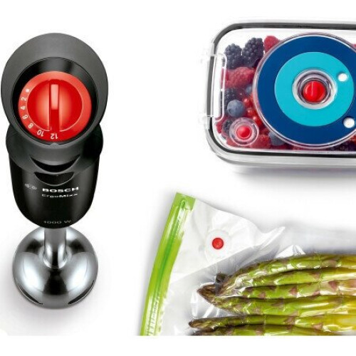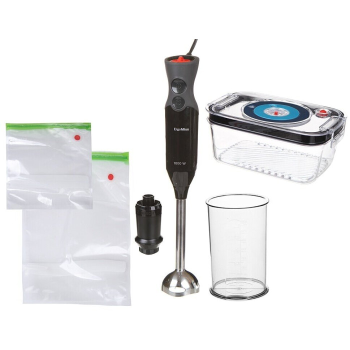 Код товара: 527308 Тип - погружной; Вакуумный - да; Максимальная мощность - 1000 Вт; Управление - механическое, число скоростей: 12, плавная регулировка скорости; Дополнительные режимы - турборежим ; Вакуумный насос - есть; Мерный стакан - есть, объем 0.6 л; Венчик для взбивания - есть; Материал корпуса - пластик; Материал погружной части - металл; Размеры (Ш*В*Г) - 6.2x39.3x5.5 см; Вес - 1.89 кг; Дополнительная информация - вакуумный насос, вакуумный контейнер для хранения (1,0 л), 6 вакуумных мешков для хранения;