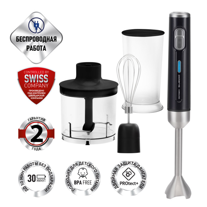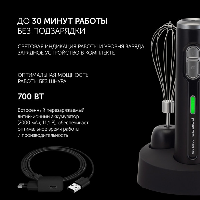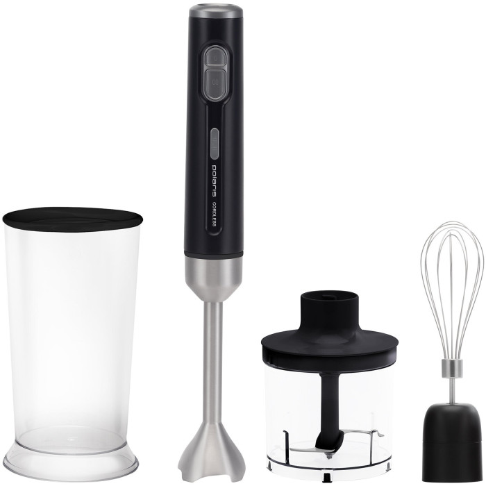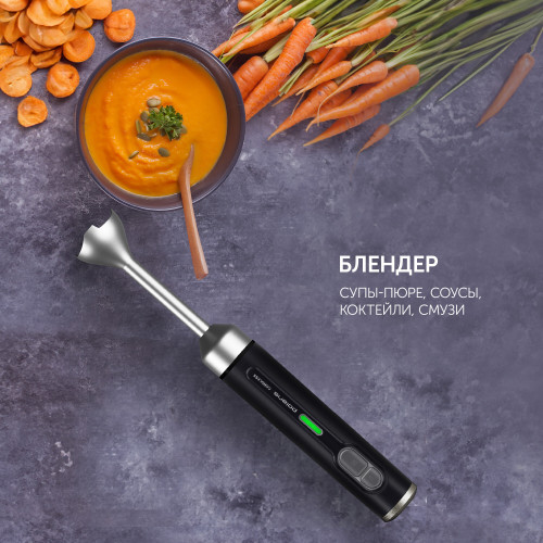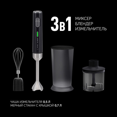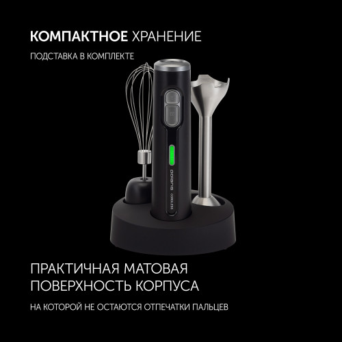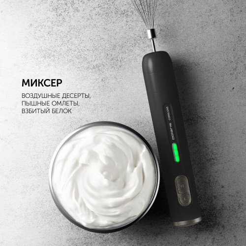 мерный стакан, USB-кабель, блок электродвигателя, венчик для взбивания, зарядное устройство, насадка-блендер, подставка для аксессуаров, руководство по эксплуатации, чаша измельчителя с крышкой