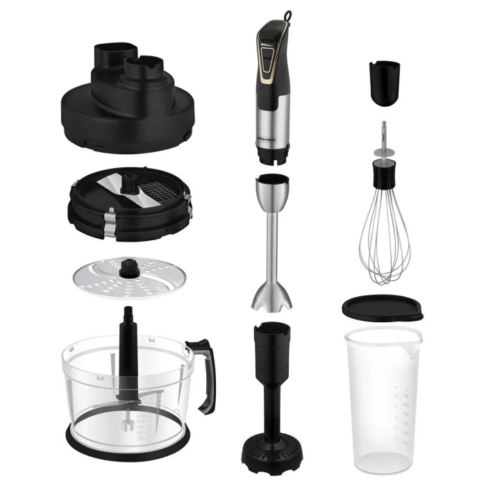 блендер; мерный стакан; насадка для взбивания; насадка для пюре; чаша измельчителя.