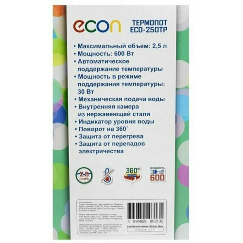 Тип: термопот; Объем: 2.5 л; Мощность: 2600 Вт; Материал корпуса: металл, пластик; Насос: механический; Тип нагревательного элемента: закрытая спираль; Особенности: индикация включения, индикатор уровня воды;