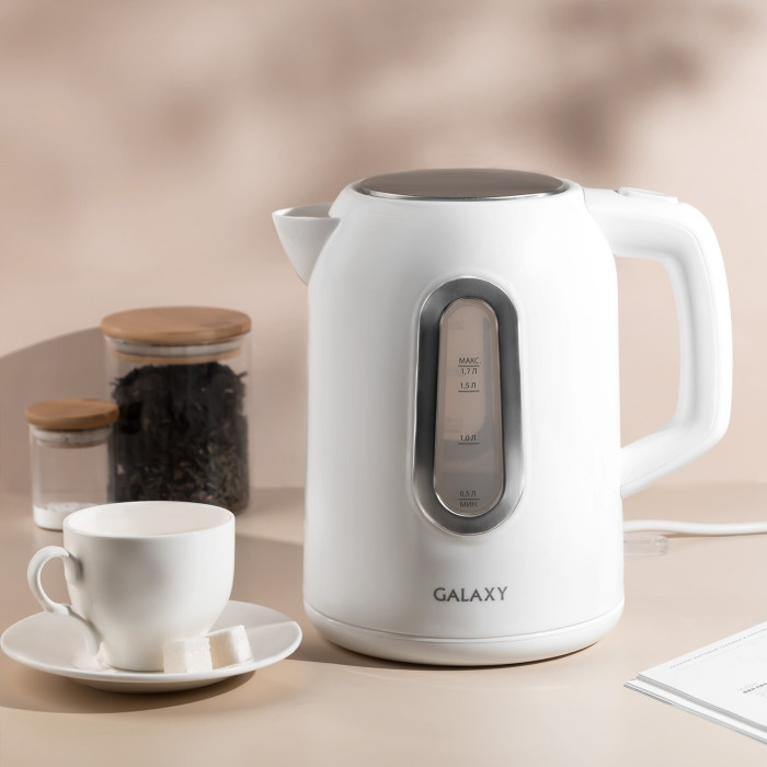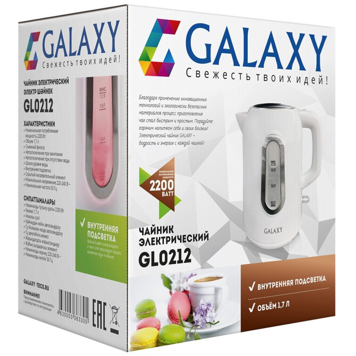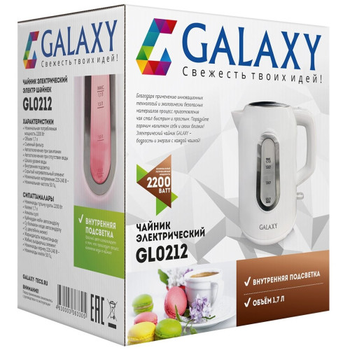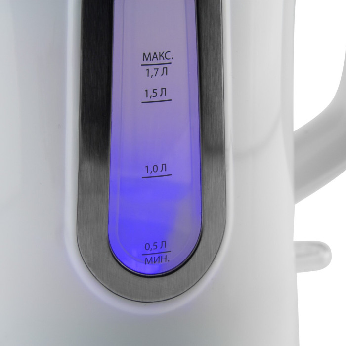 Материал корпуса - пластик; Мощность, Вт - 2200; Объем л. - 1,7; Подсветка - есть; Тип нагревательного элемента - скрытый; Указатель уровня воды - есть; Цвет - белый;