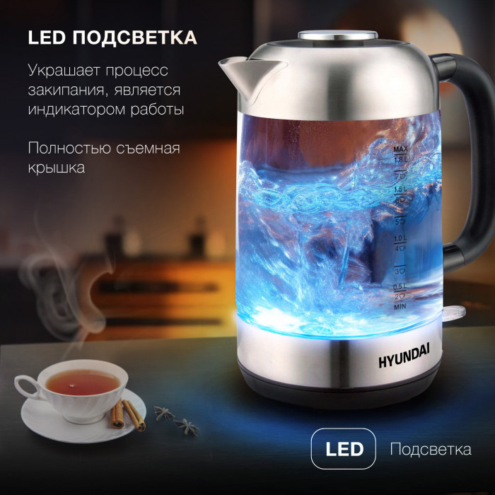 "Индикатор включения, индикатор уровня воды, фильтр от накипи, автоматическое отключение, защита от включения без воды, подсветка воды, подставка 360 градусов, полностью съемная крышка"