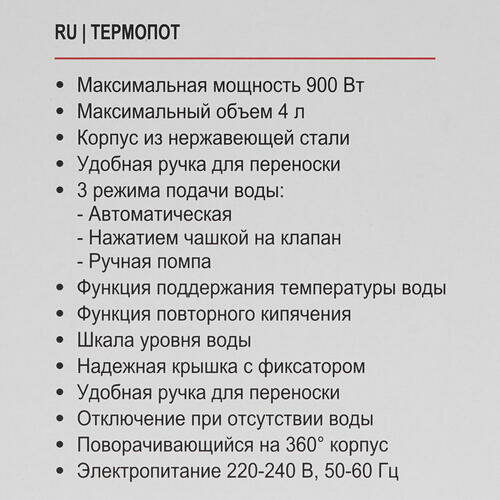 Блокировка включения без воды, Открывание крышки кнопкой, Ручка для переноски, Функция повторного кипячения, кнопка подачи воды, ручка для переноски.