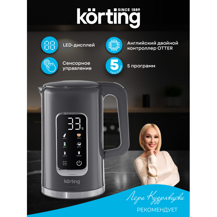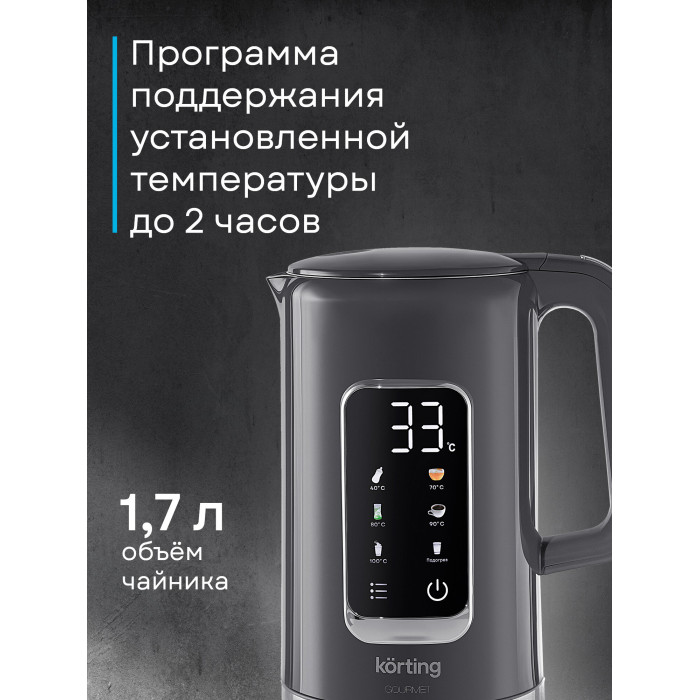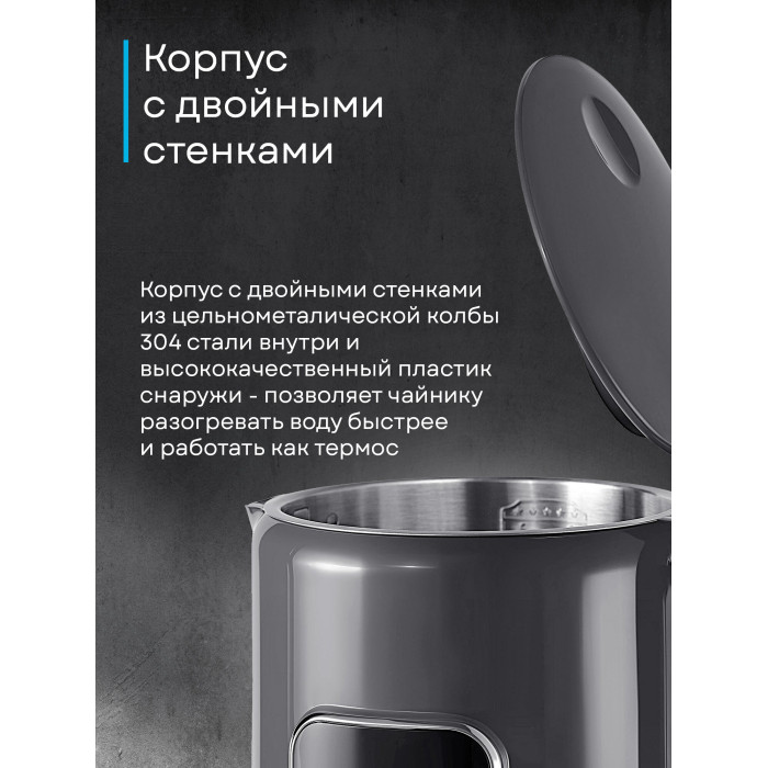 Вращение подставки на 360°, Выбор температуры нагрева воды, Подсветка емкости, Регулировка температуры, Светоиндикатор работы, Двухслойный корпус, Дисплей