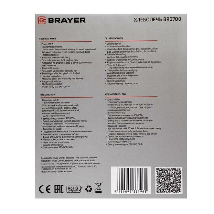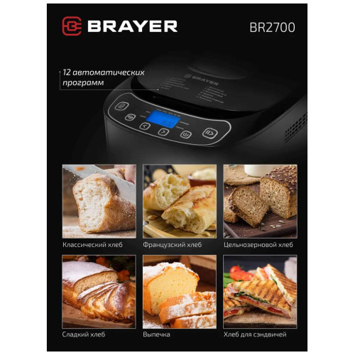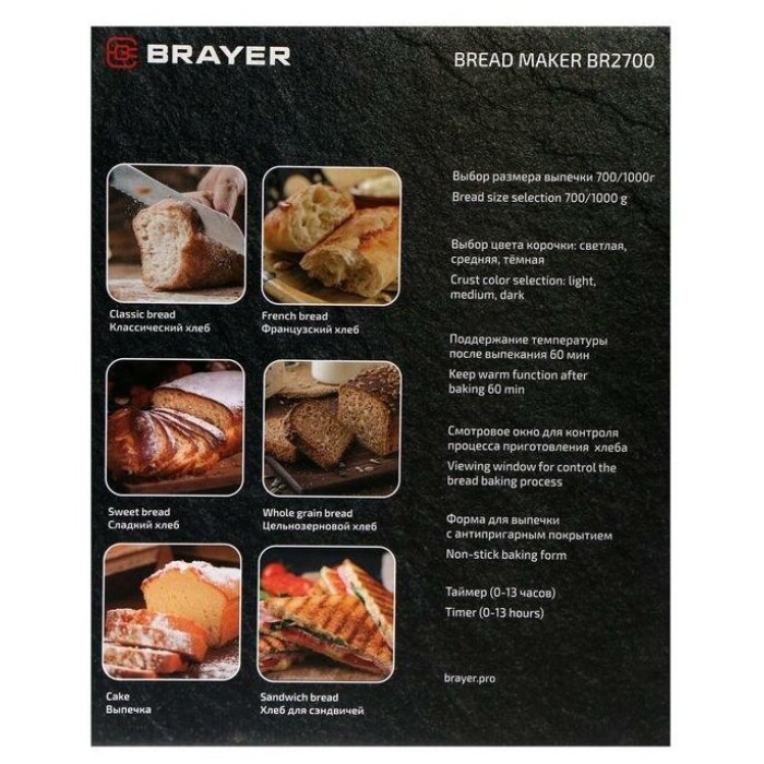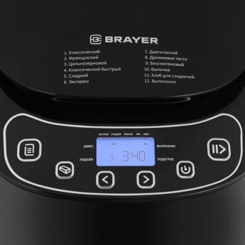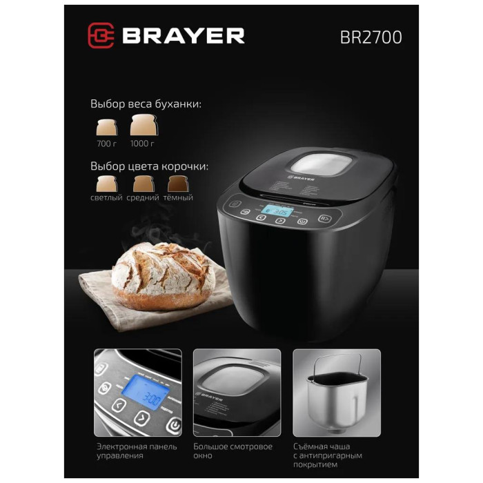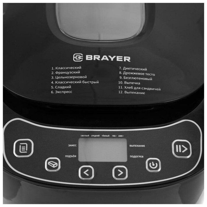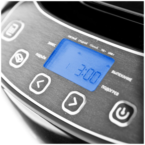 выбор цвета корочки, диспенсер, поддержание температуры, регулировка веса выпечки, таймер, Дисплей, стакан и книга рецептов в комплекте, мерные ложка