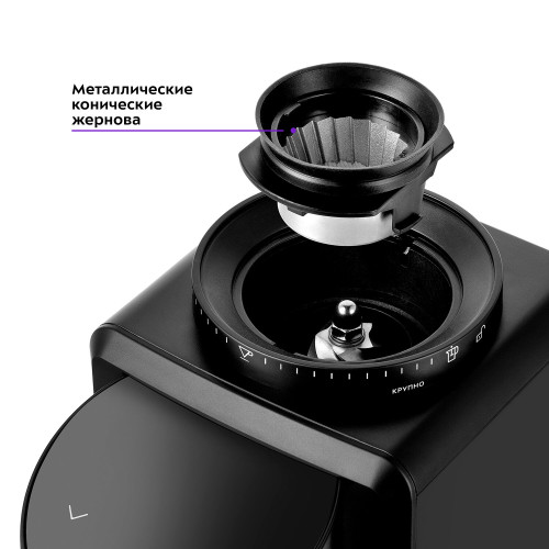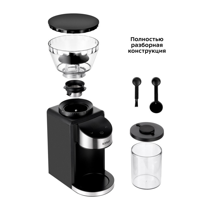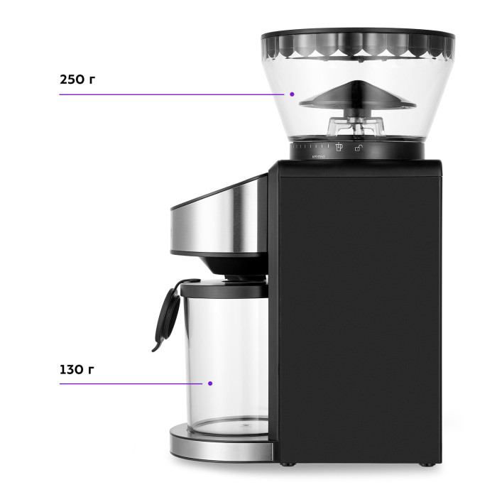 съемные контейнеры для молотого кофе, для зёрен и внешний жернов, щеточка для чистки жерновов в комплекте; длина сетевого шнура 1.05 м