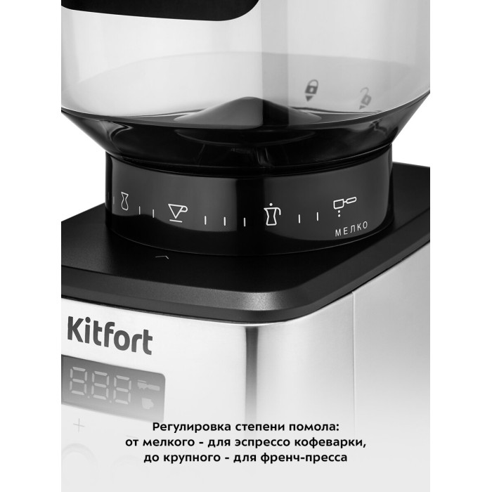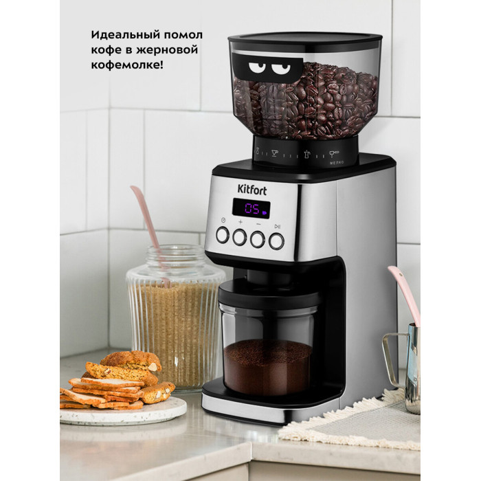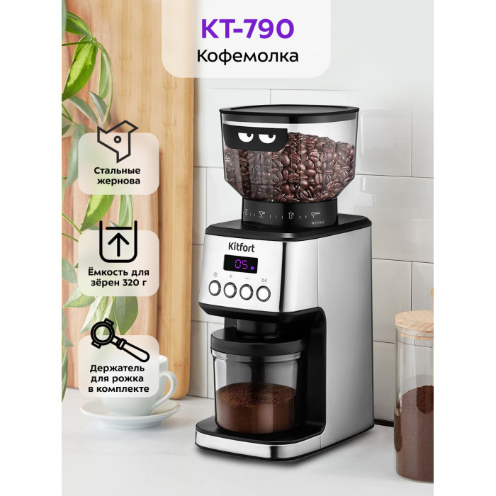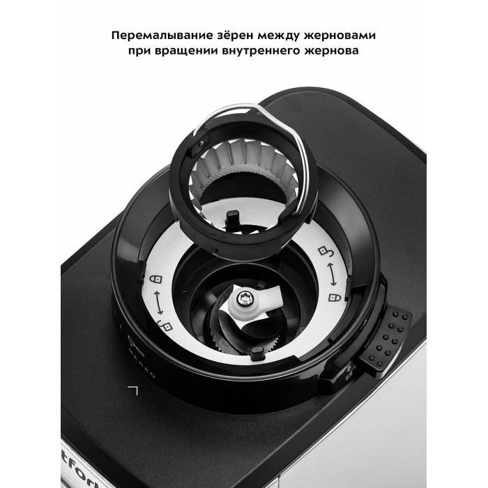 Комплектация 1. Кофемолка — 1 шт. 2. Контейнер для зерен с крышкой — 1 шт. 3. Контейнер для молотого кофе с крышкой — 1 шт. 4. Внешний конус-жернов (уже установлен) — 1 шт. 5. Держатель рожка — 2 шт. 6. Щеточка для чистки — 1 шт. 7. Руководство по эксплуатации — 1 шт. 8. Коллекционный магнит — 1 шт.* *опционально